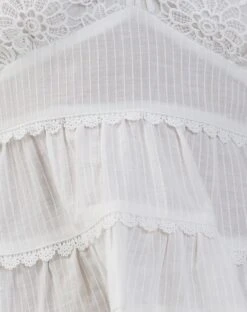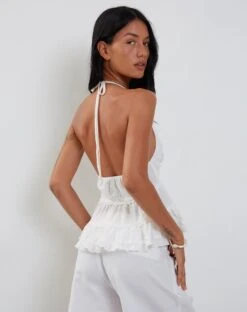 Juanita features a deep crochet halter neckline with a double layered frill hem and scallop trim detailing.