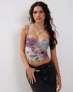 Our Kikan cropped cami features thin straps and piped cup detailing in a printed bodycon mesh. Style with a denim maxi for the perfect day to night ‘fit.