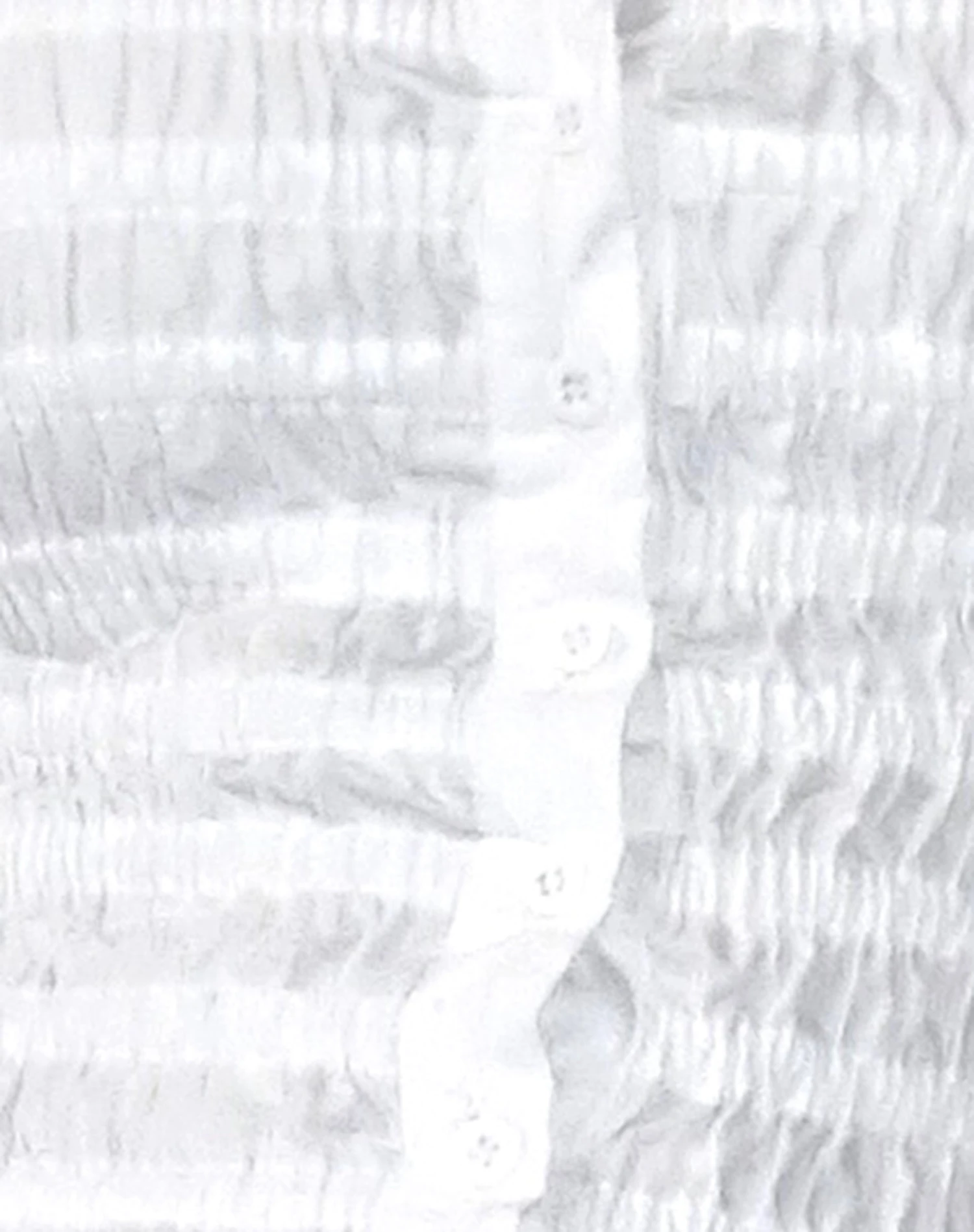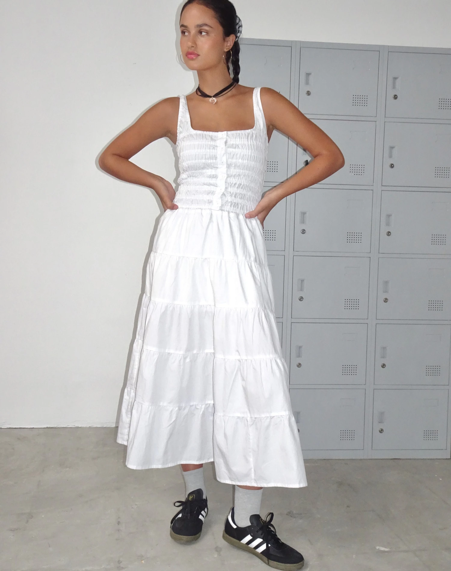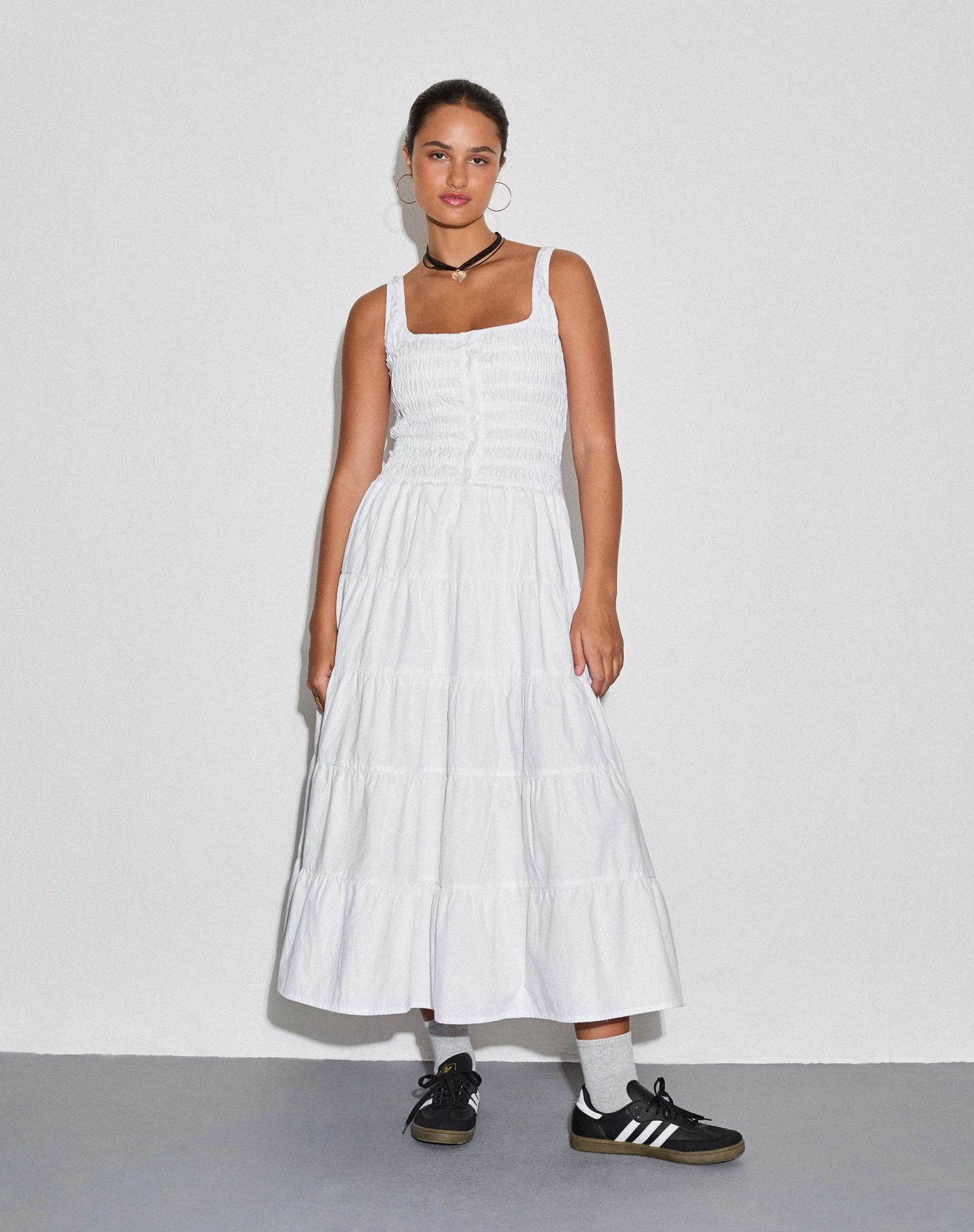 The Koizumi dress, in poplin white, features a tiered design with a maxi length hem, thick, cami straps and a square neckline. Complete with button fastenings down the front and ruched detailing.