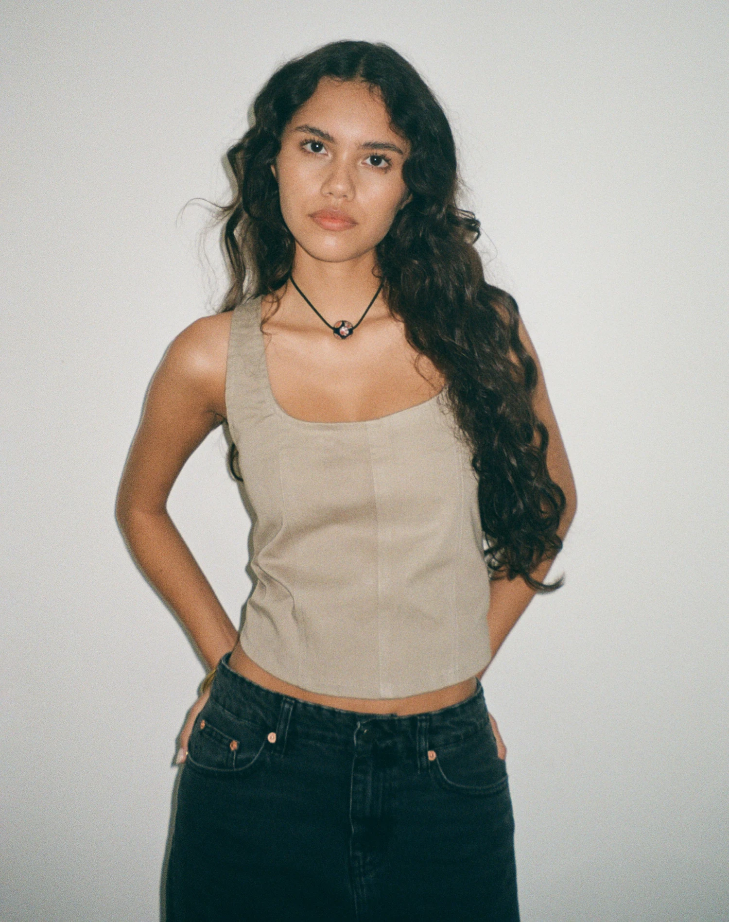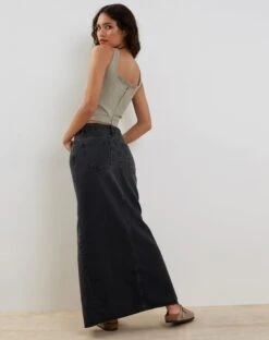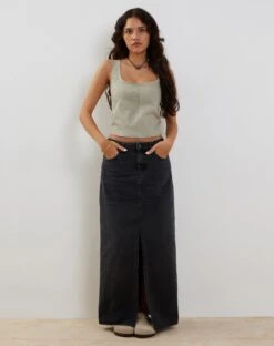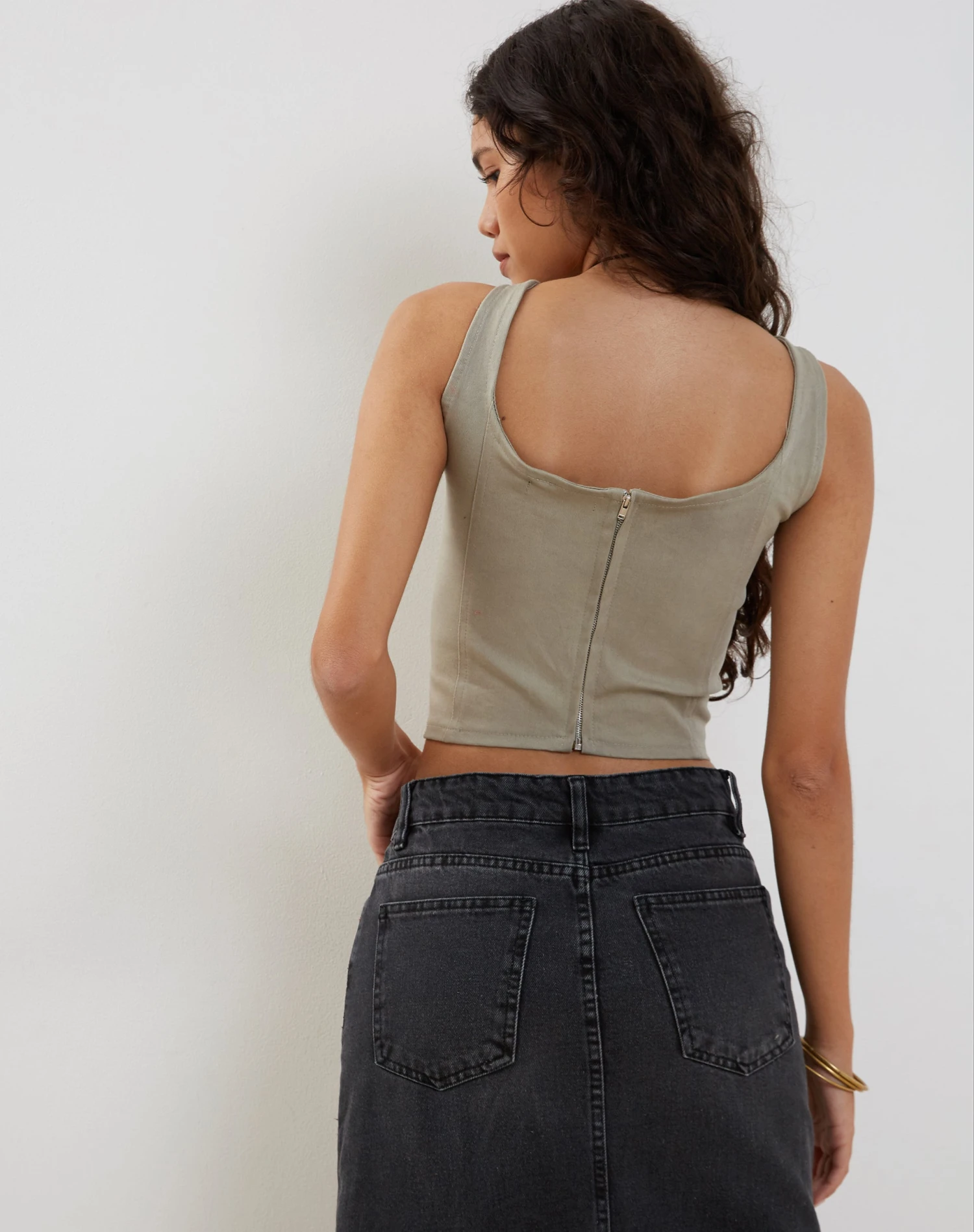 In a ash grey, the kye corset features thick straps and square neckline with seam detailing design on front and a cropped fit. Get the look with our Denim Maxi Skirt.Â