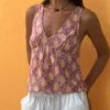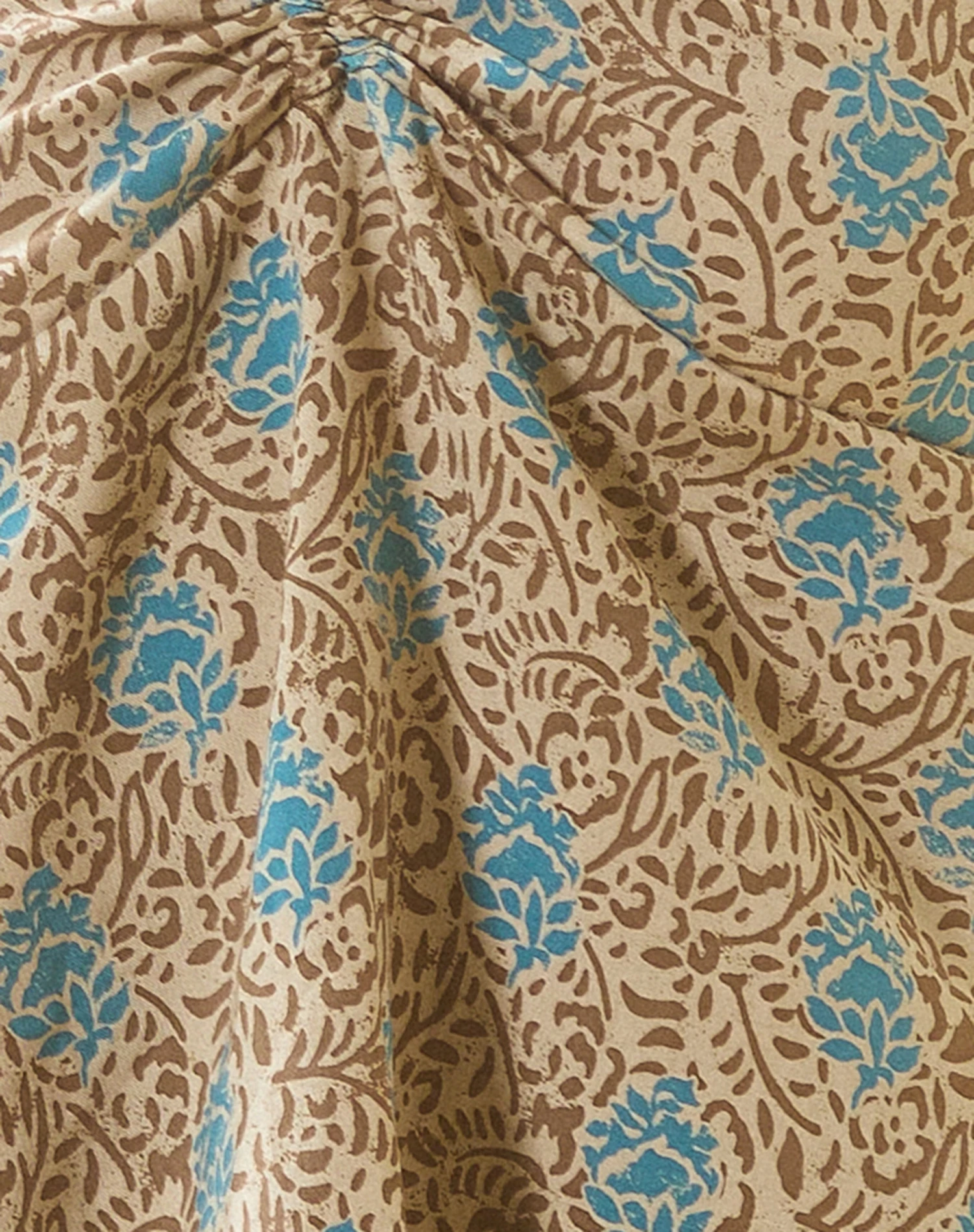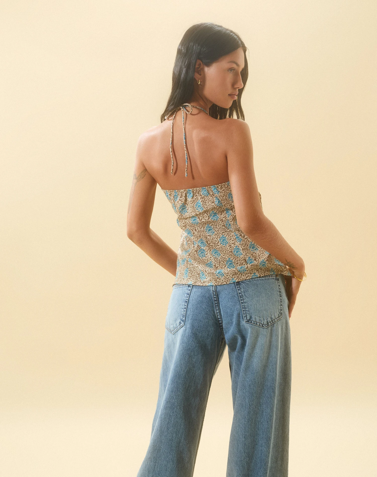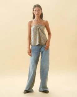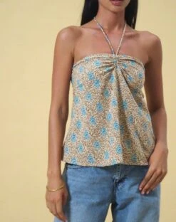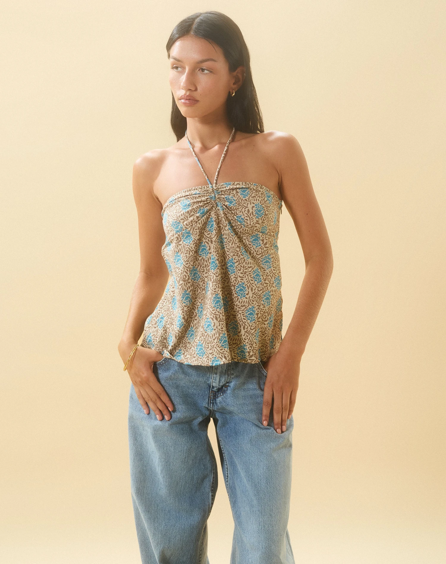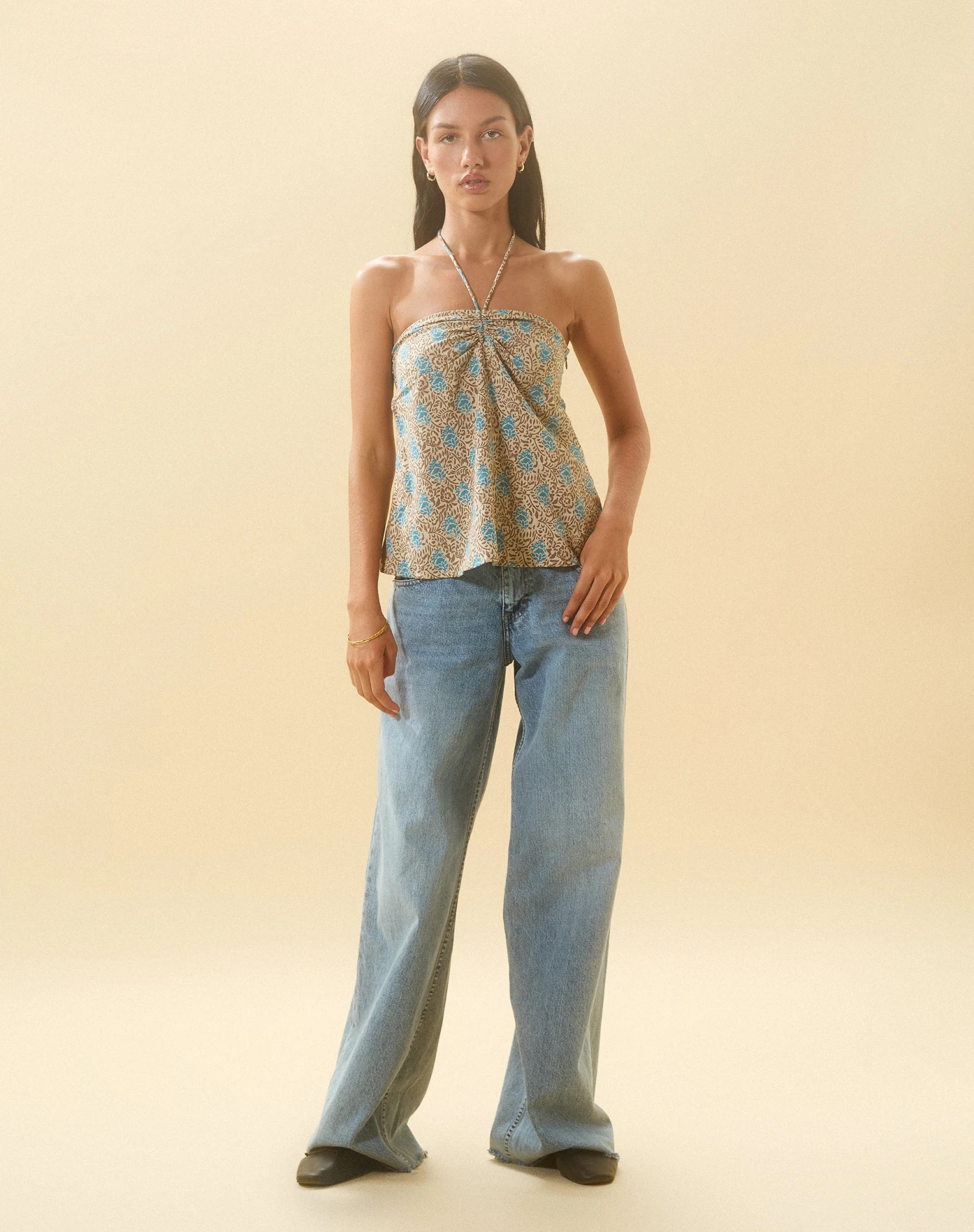 The Laeri top features a bandeau design with thin, halterneck straps and a loose fit with a regular hem in a blue and brown fabric. Complete with a repeat paisley print. We love to wear with the Roomy jean.
