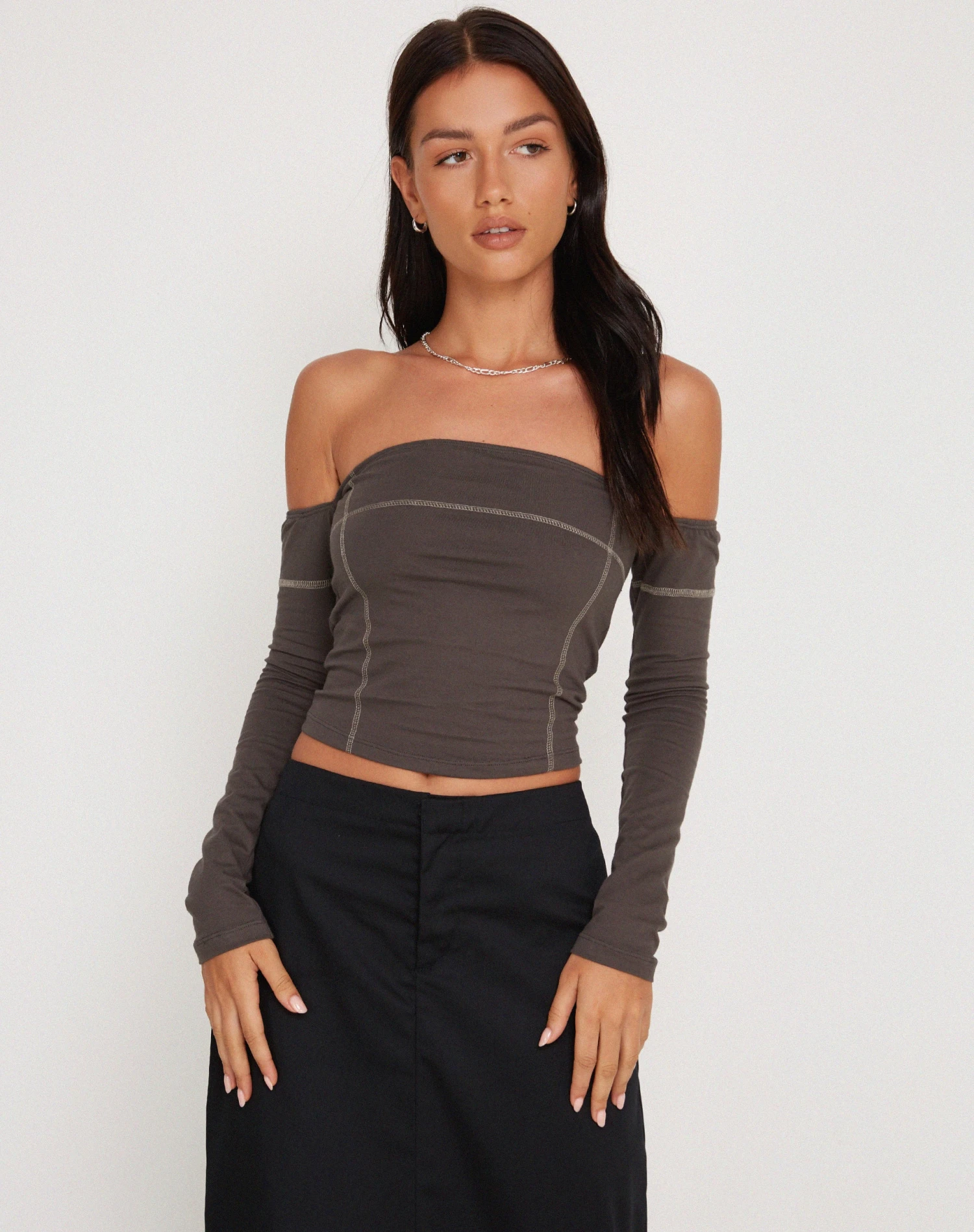 Spice up your basics with our Lan top. It features a cropped bandeau design with a bodycon fit, and long sleeves in a lycra fabric. Detailed with grey contrast contour top stitching.Â