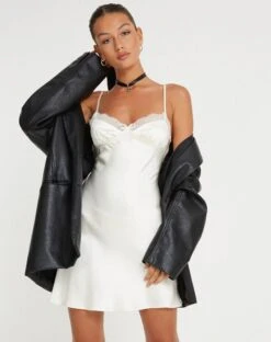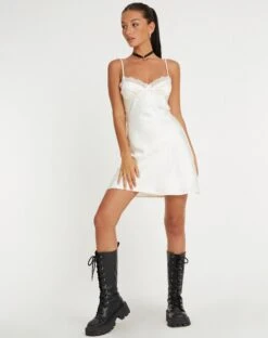 Keep it chic with the Larue dress. In satin ivory, this party dress features thin straps, lace detailing on the cups and a mini length hem.