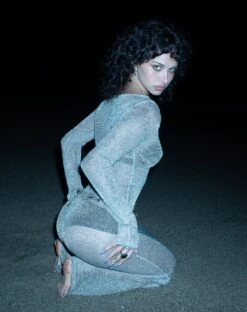 Nail the futuristic look with our Lavinia Dress. Featuring long sleeves and a maxi length in a silver chain material.