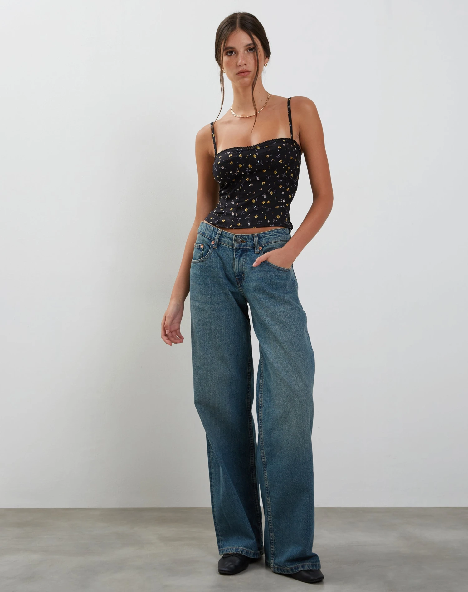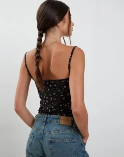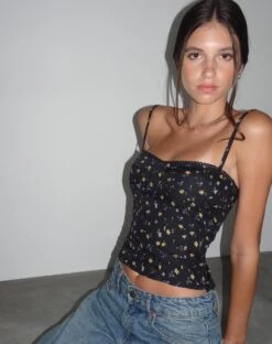 In a pretty petal print, the black Leif top features a sweetheart neckline with thin adjustable straps in a non stretch cotton material.