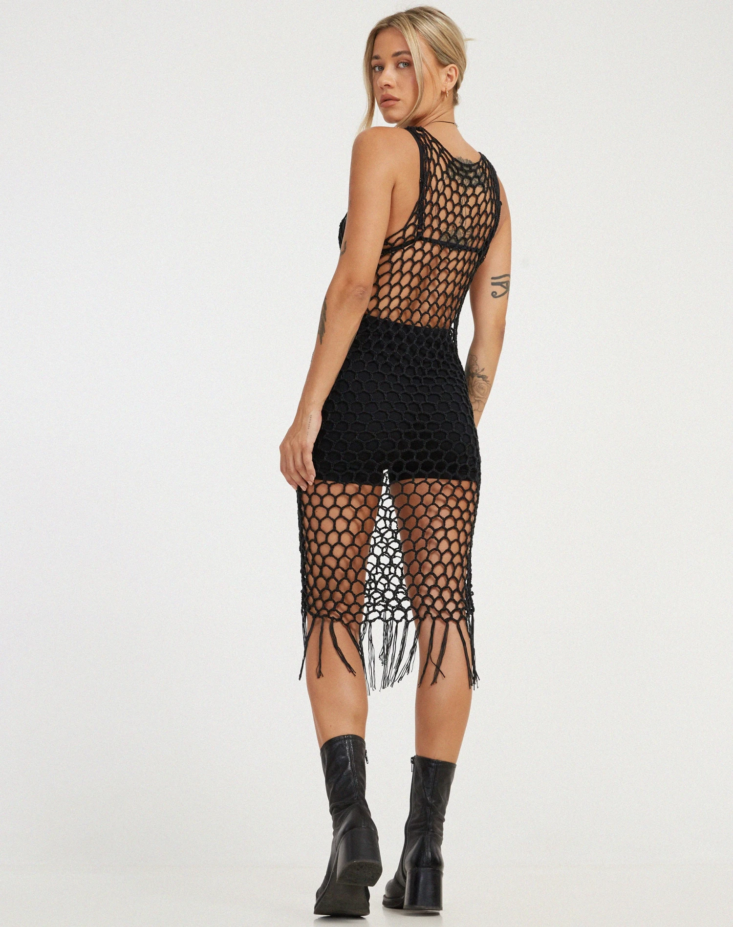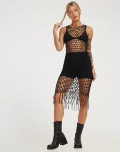 Get festival season ready with our Levio dress. In black, it features a crew neckline, fringe detailing and a netted design. Wear over some black basics for a stylish look.