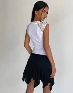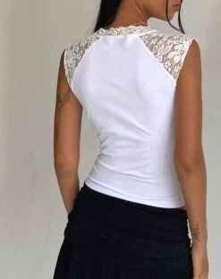 Add some lace to your wardrobe with our Livina top. In a white jersey, it features a sleeveless vest fit with lace panelling and deep v neckline with lace trim and tie up detail. We love to wear with the Tasdi skirt.Â