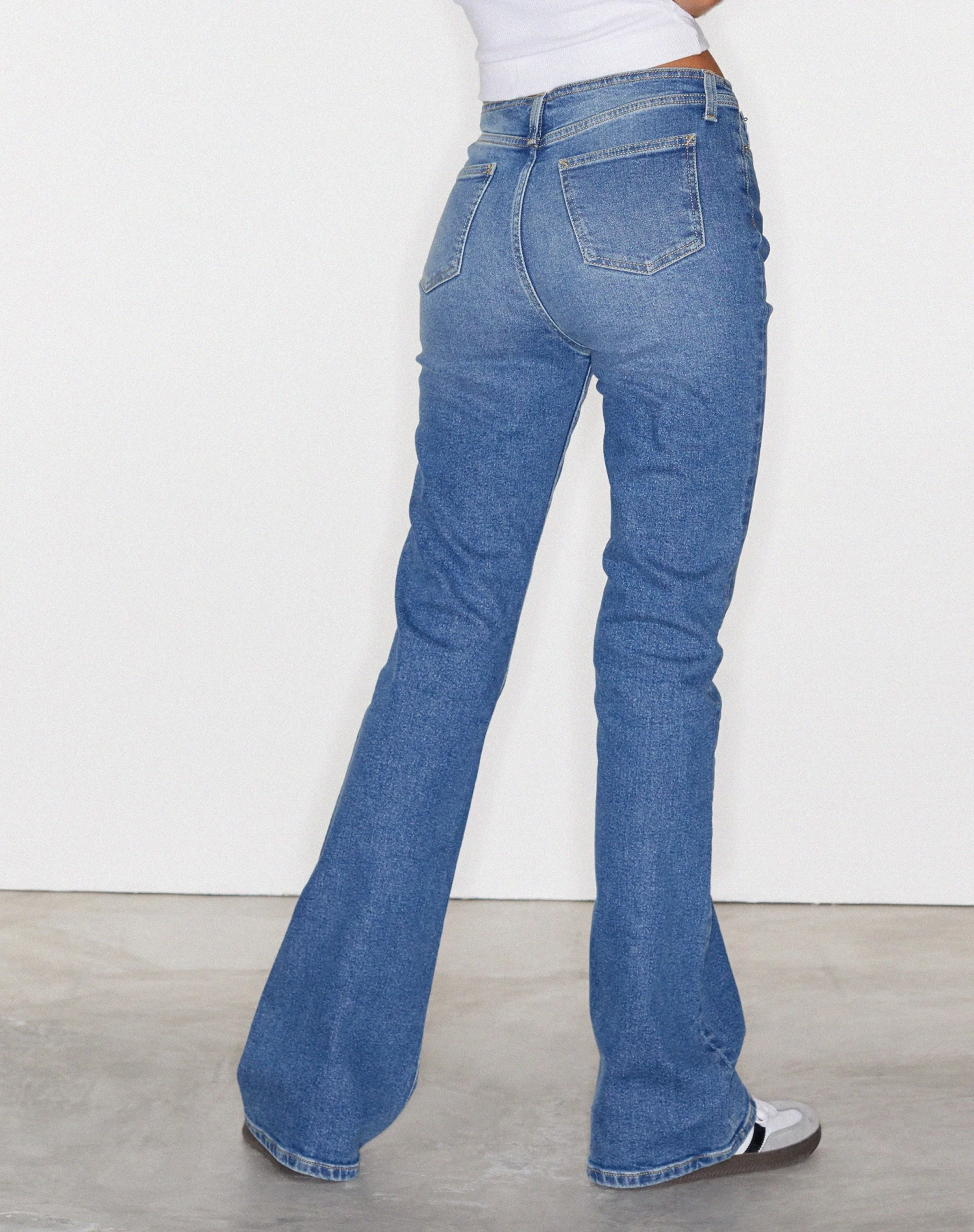 Update your everyday denim with our low rise exposed button jeans. Featuring a low rise fit, bootcut leg with button detailing in a vintage blue denim. Perfect when paired with our Yoon top.