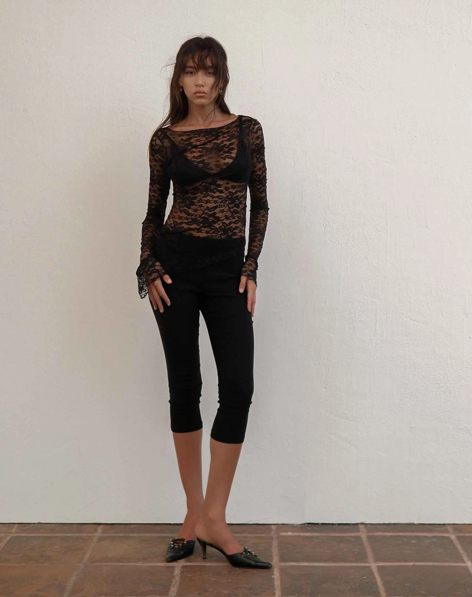 Dress up with our Lubica Top. It comes in a sheer black lace pattern, with a boat neckline and long poet sleeves. Style with a low rise denim mini for an easy night out ‘fit.
