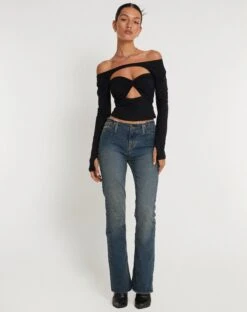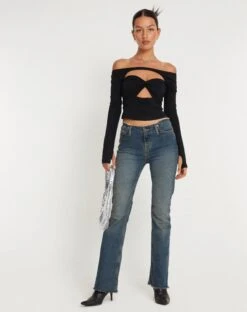 A wardrobe must have item. A black jersey two piece with long sleeve shrug design and cut out detailing bandeau top, with ruched detailing on the bust. Pair with our Frayed Low Rise jeans for the perfect outfit.