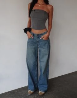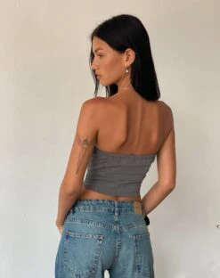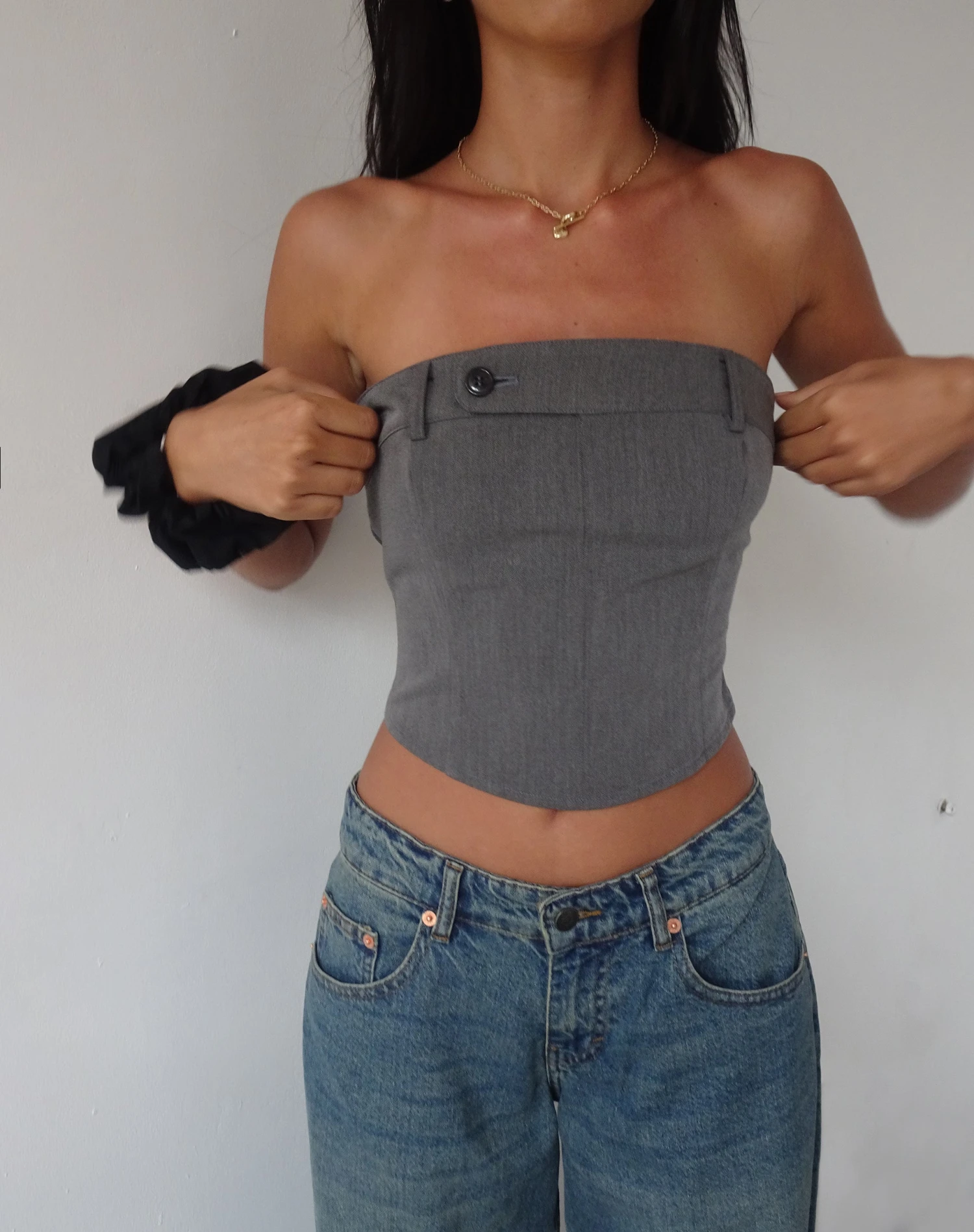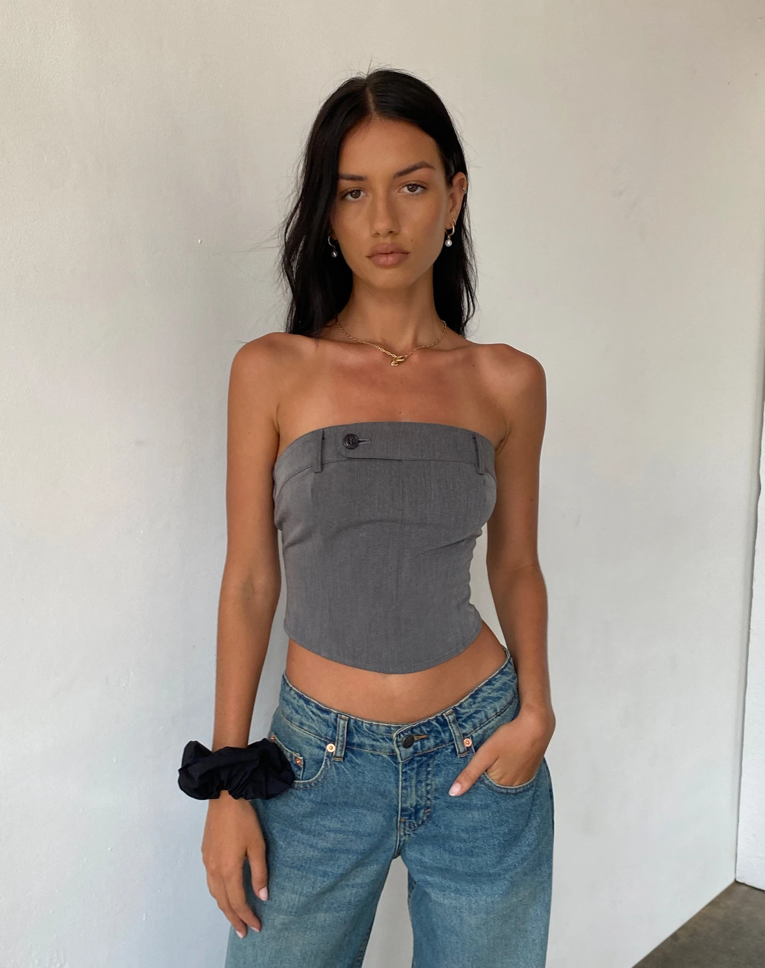 Our Manaf corset is your new statement top for any occasion. Featuring a curved hem fit with belted bust detail in a tailored charcoal. Pair with our Roomy jean for a cute ‘fit.Â