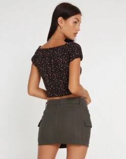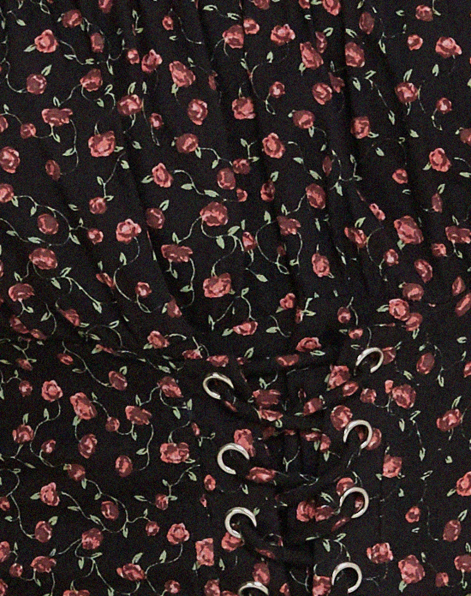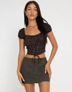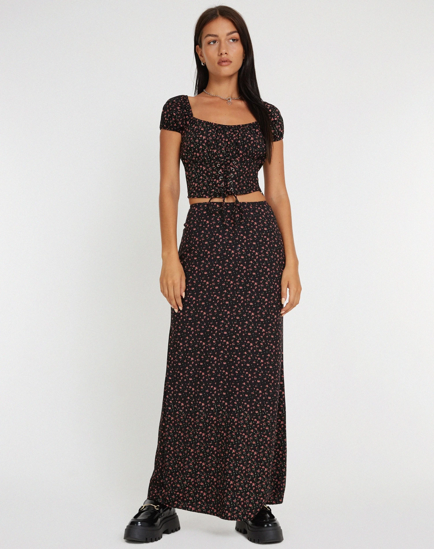 In a pink floral print, the Mave top features short, cuffed sleeves, and a cropped fit. Finished with lace up detailing at the front, and a frill hem. Complete the co-ord with our Easton skirt.Â