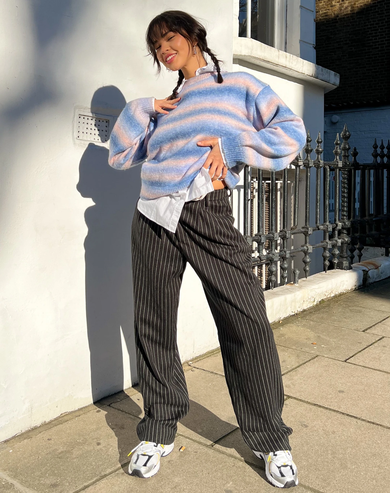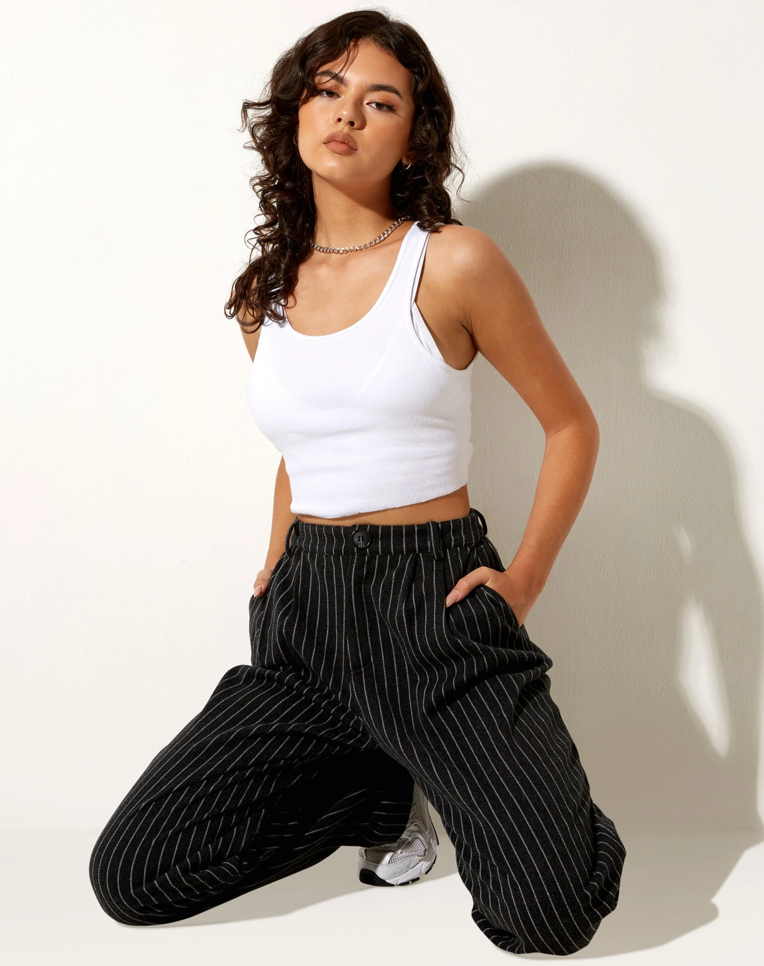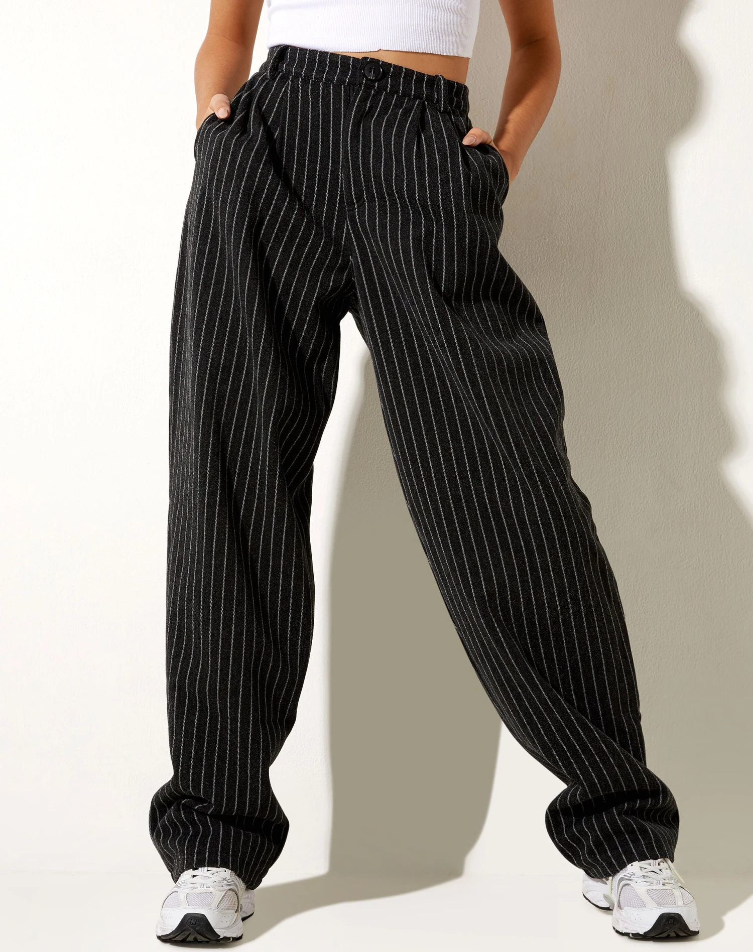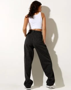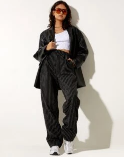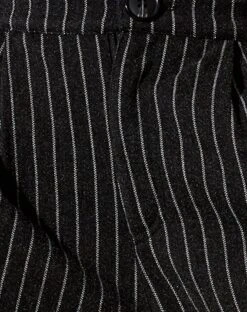 Our Misha trousers are perfect for all occasions. Featuring a high waisted fit with wide leg and button fastening in a black pinstripe. Complete the look with a basic top and Saken blazer in black.