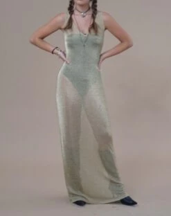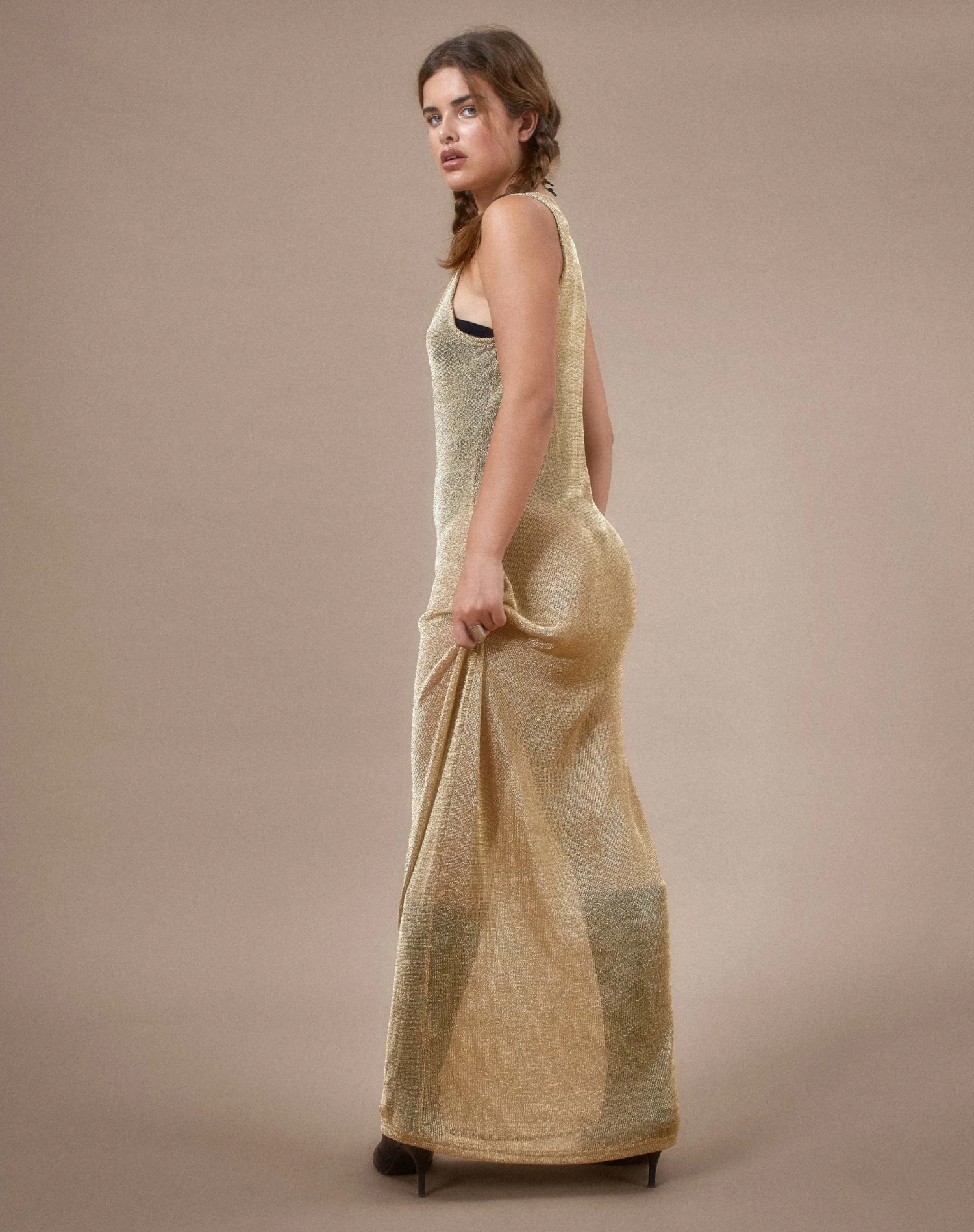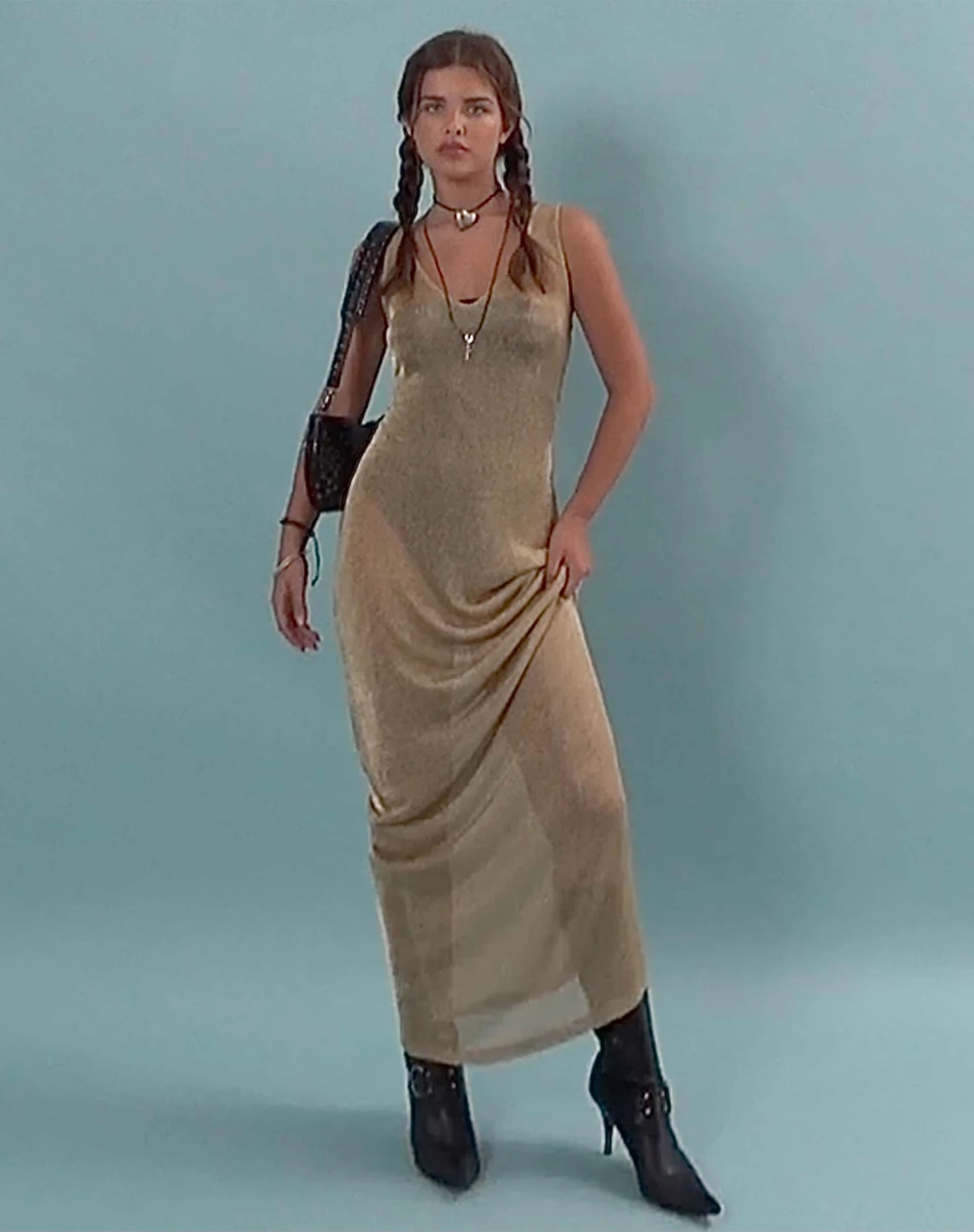 Level up your festival ‘fit with our Morticia dress in gold. In a sheer chain knit, it features a loose, maxi fit with thick, cami straps and a plunge neckline.