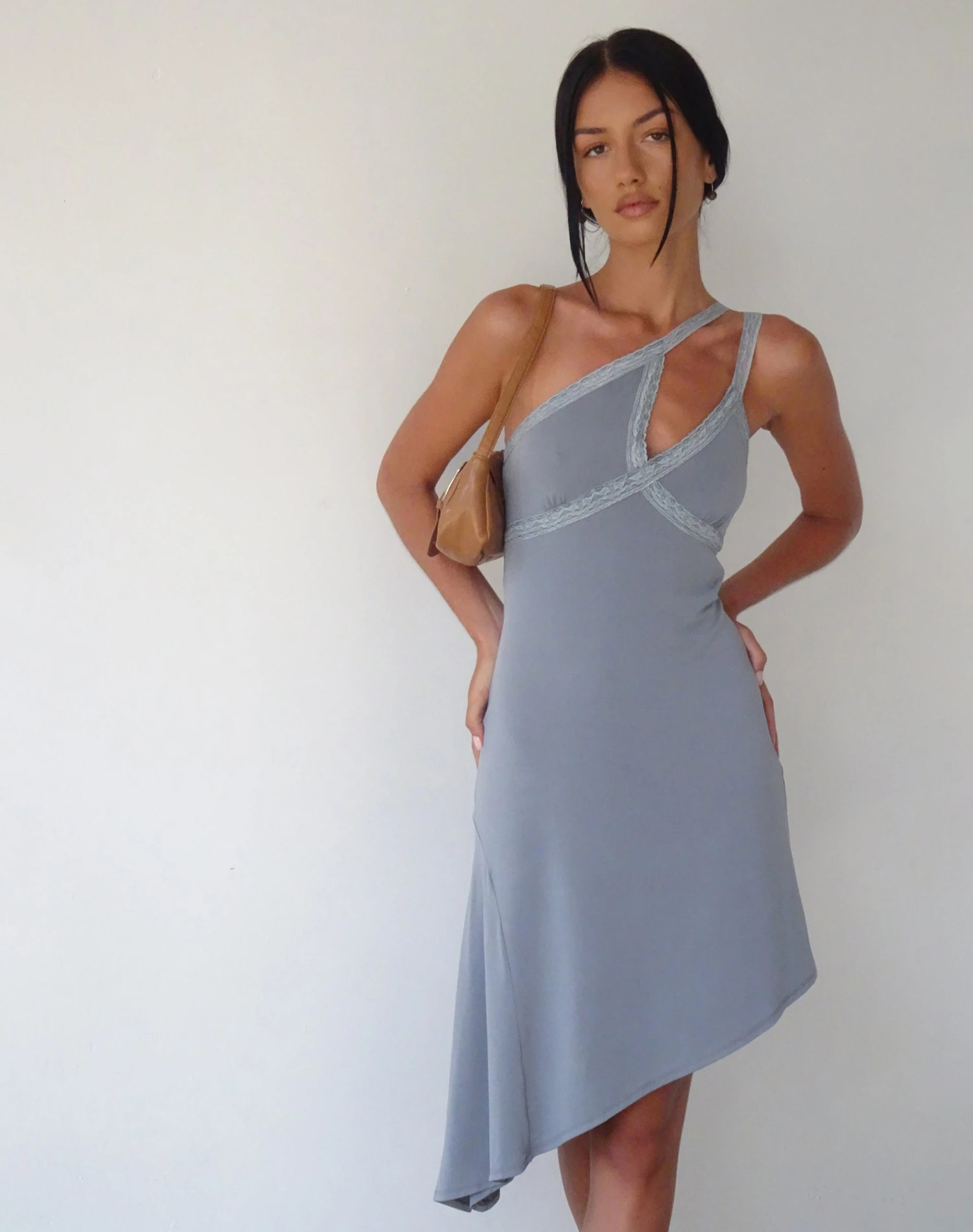 Our Chrissy Dress features an asymmetric hemline, a one shoulder strap with a cut out at the chest, in a slinky grey material with tonal lace across the chest and strap.