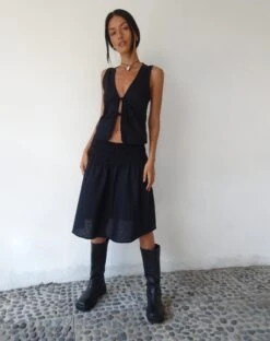 In a black cotton rami fabric, the Neleta skirt features a loose, midi fit with subtle pleating. Complete with ruffle detailing to the waistband. Get the look with the Dudley  vest top.Â