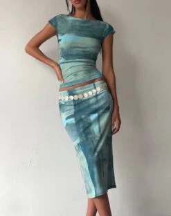 Spruce up your wardrobe with our latest print. In a tonal blue and green paint brush abstract, the Nova mesh top features cap sleeves with a boat neckline. Complete the co-rd with our Gia skirt.Â