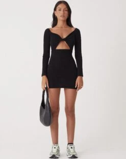 Our Sadia Mini Dress is the perfect ‘little black dress’ for any occasion. In crepe black, it features long sleeves, a plunge neckline and cut out detailing at the front. Finish the look off with a black bag and some white trianers.