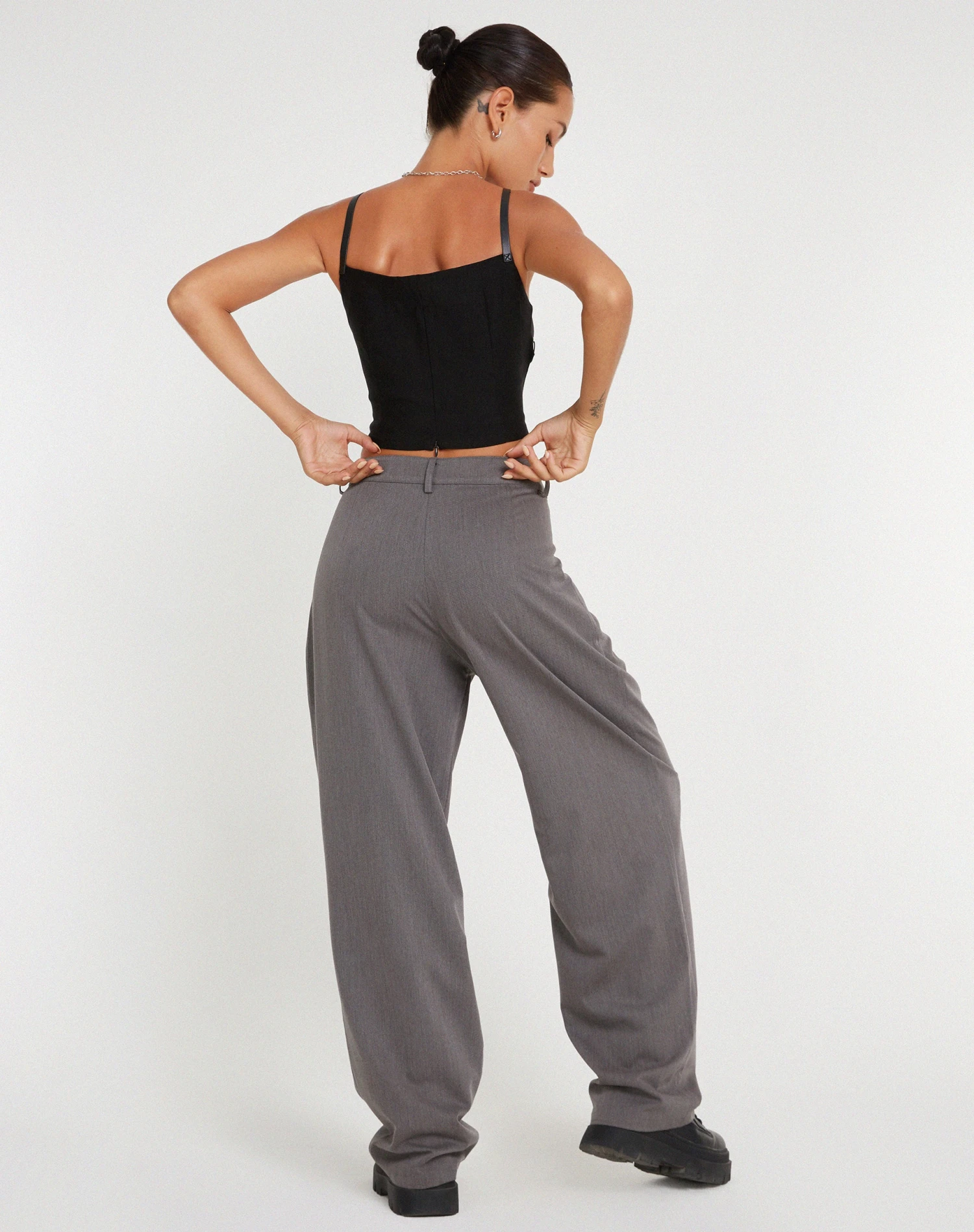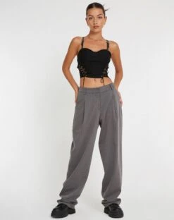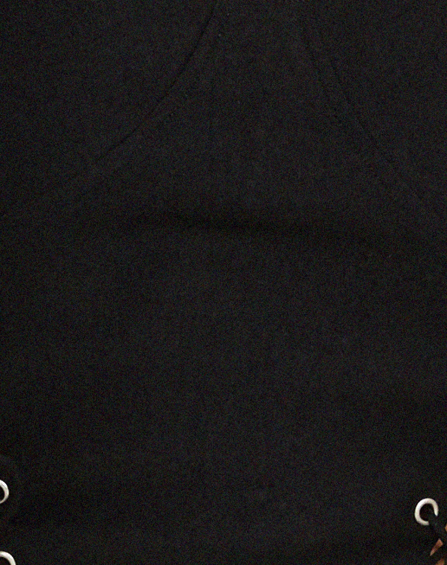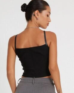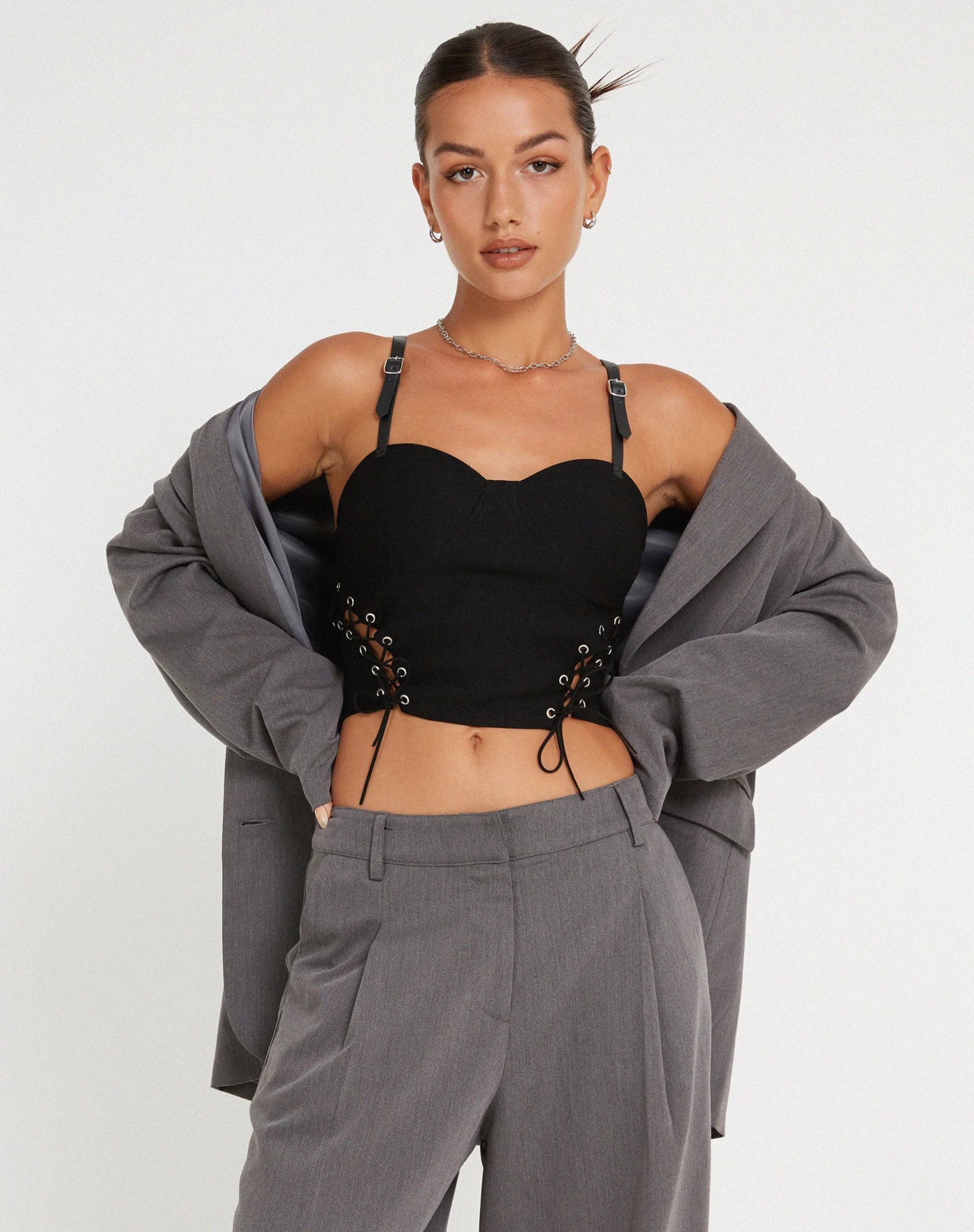 Black crop top, in a stretch tailoring material, with thin, adjustable straps. Featuring a cupped bust, and a lace up front detailing on both sides. Complete the ‘fit with our Maiwa blazer and Sakaria trousers.