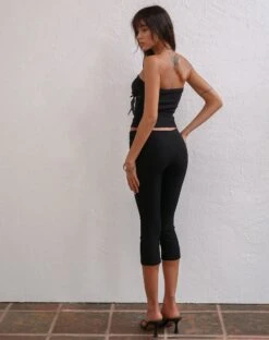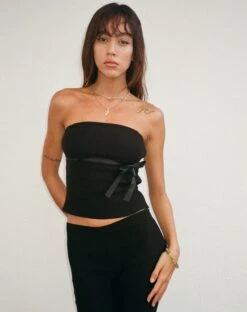 In a stretch tailoring fabric, our Novita top features a bandeau neckline and bodycon fit with a decorative bow detailing. We love to style with our Asla capris.