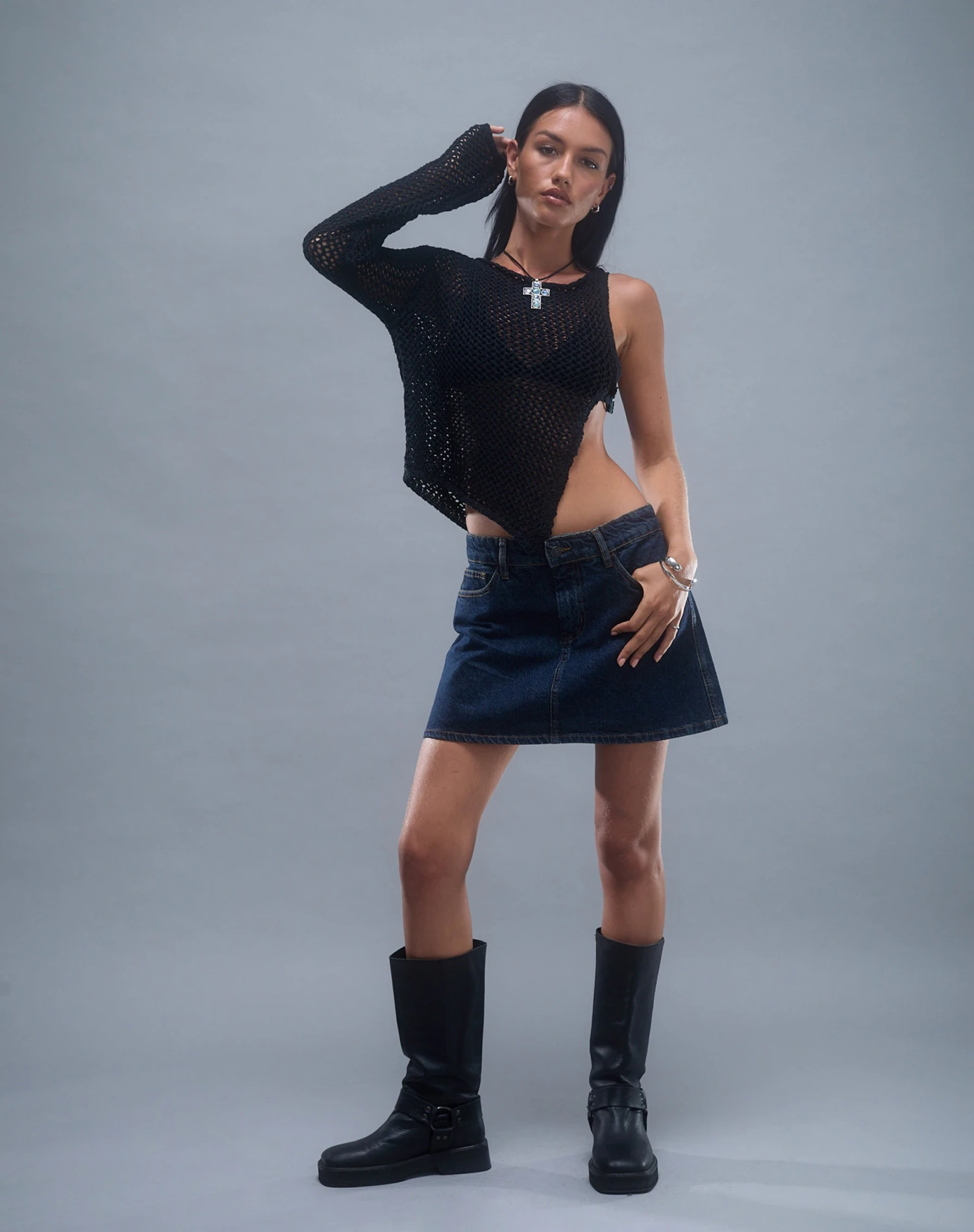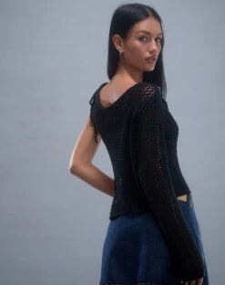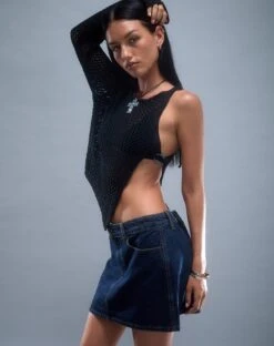 In a black open knit, our Nung top features an asymmetric one sleeve design with an open side detail fastened with a resin o ring. We love to pair with a low rise mini.
