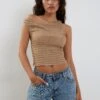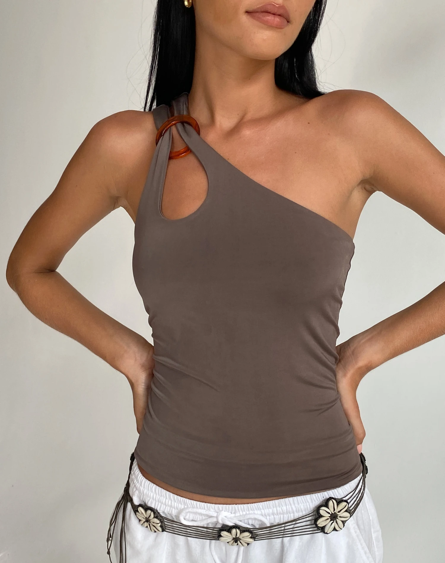 In a slinky mocha, our Odette top features a one shoulder design with resin o ring detailing and an asymmetric hem in a bodycon stretch fit.