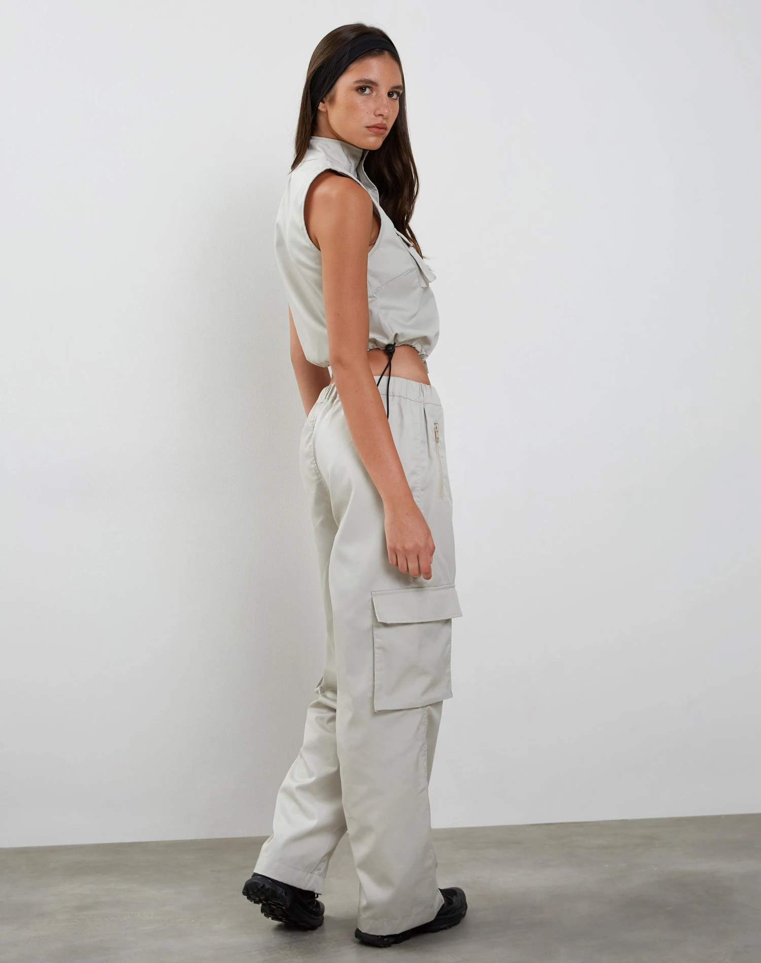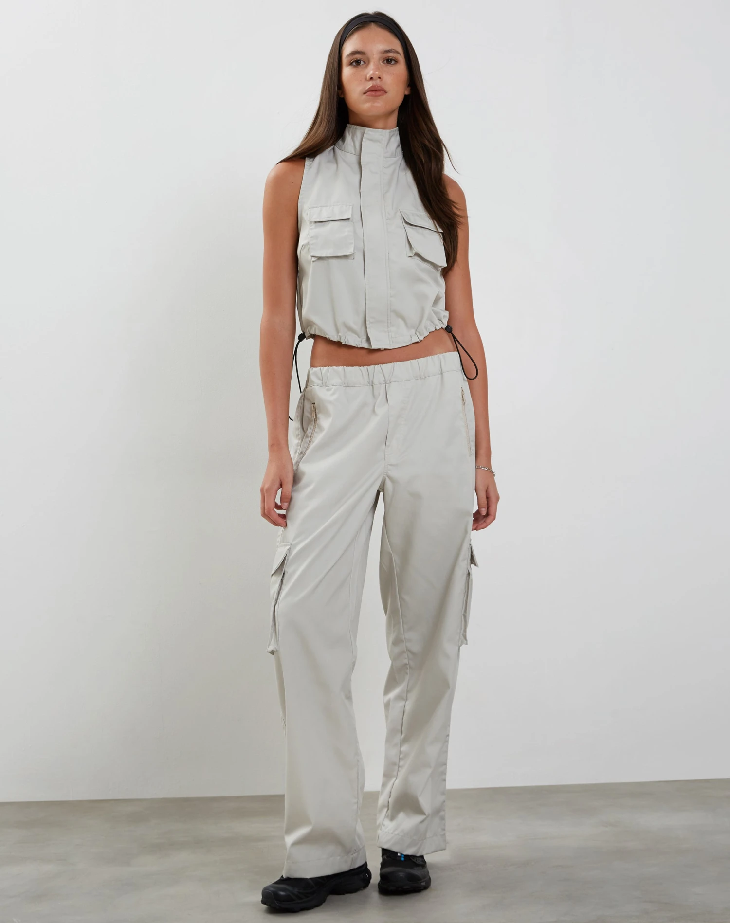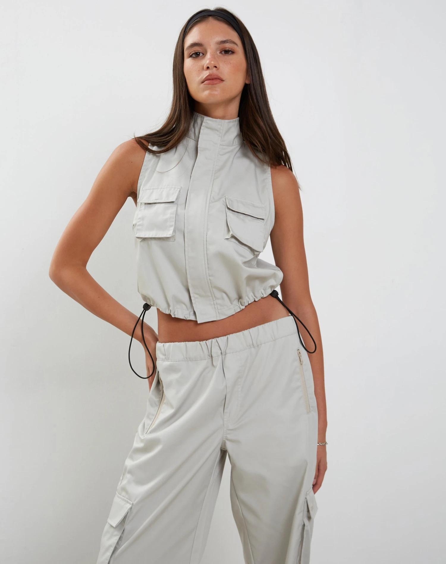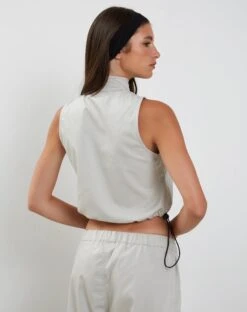 In a pearl grey cotton drill fabric, our Pae vest features a loose, sleeveless fit with a zip-up front and a high neckline. Complete with utility pockets and drawstring toggles for an adjustable hem. Get the co-ord with our Oriells trouser.Â