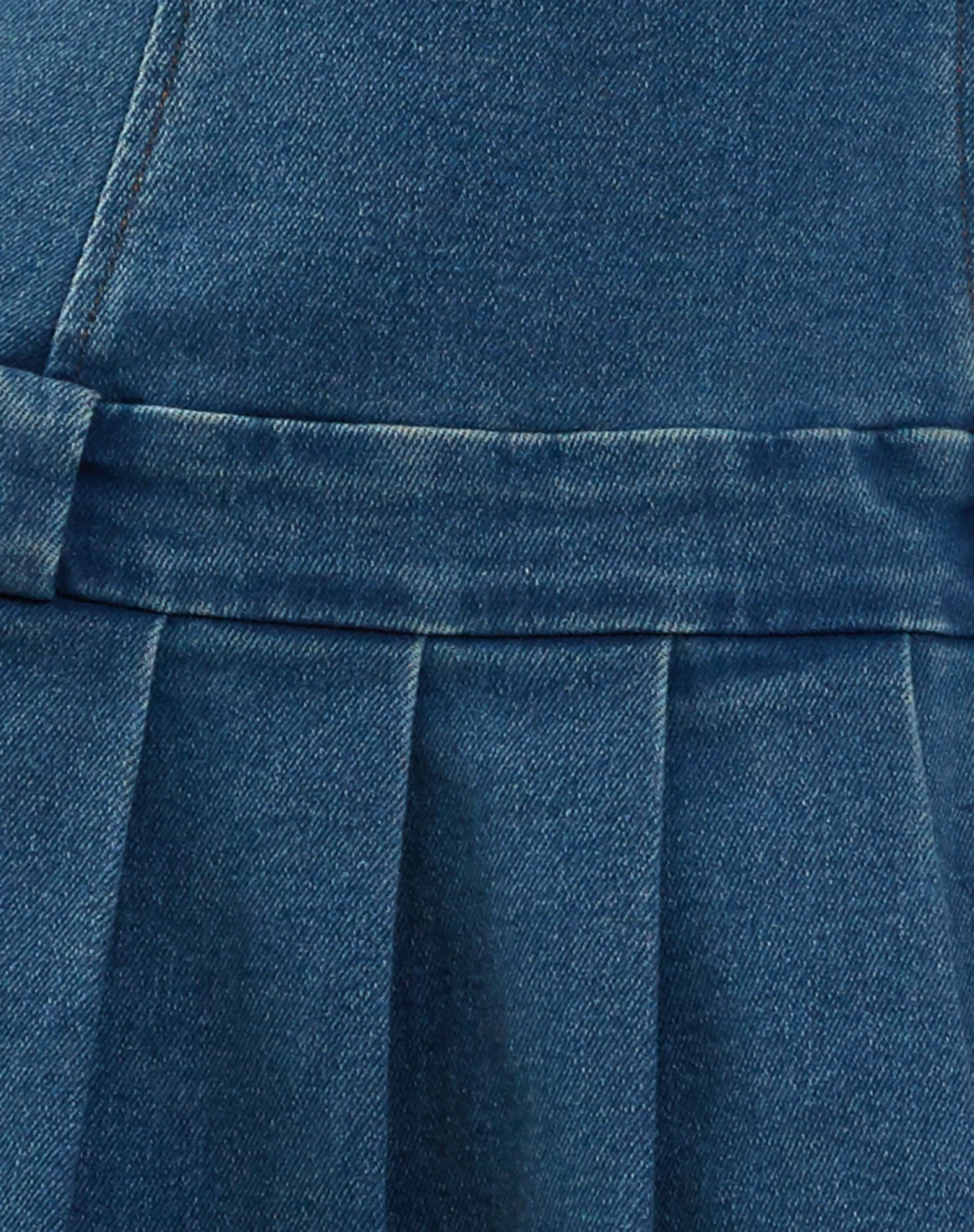 Bandeau blue wash mini dress in a bodycon stretch denim. Featuring a low waist belt detail and knife pleated skirt with side zip fastening.