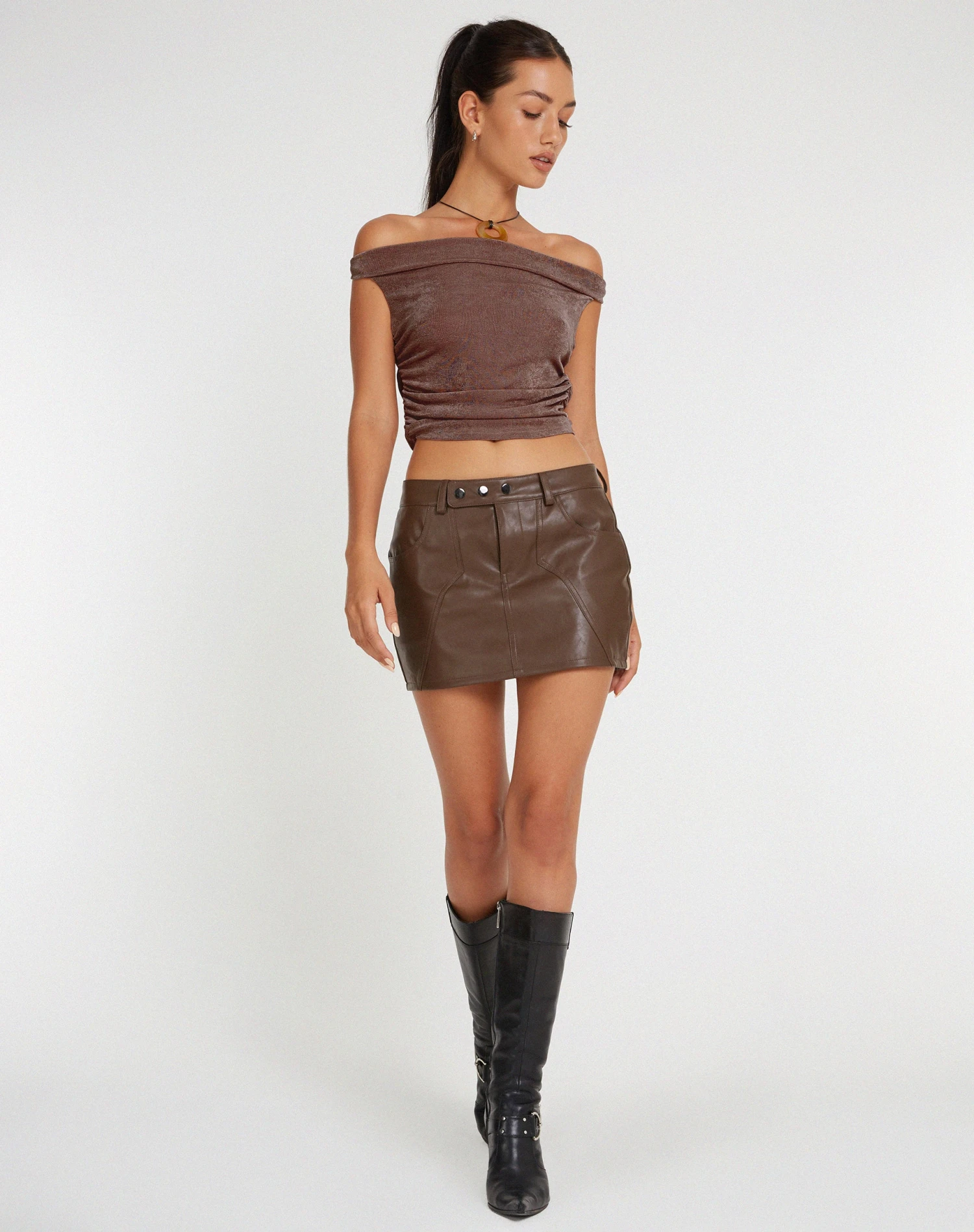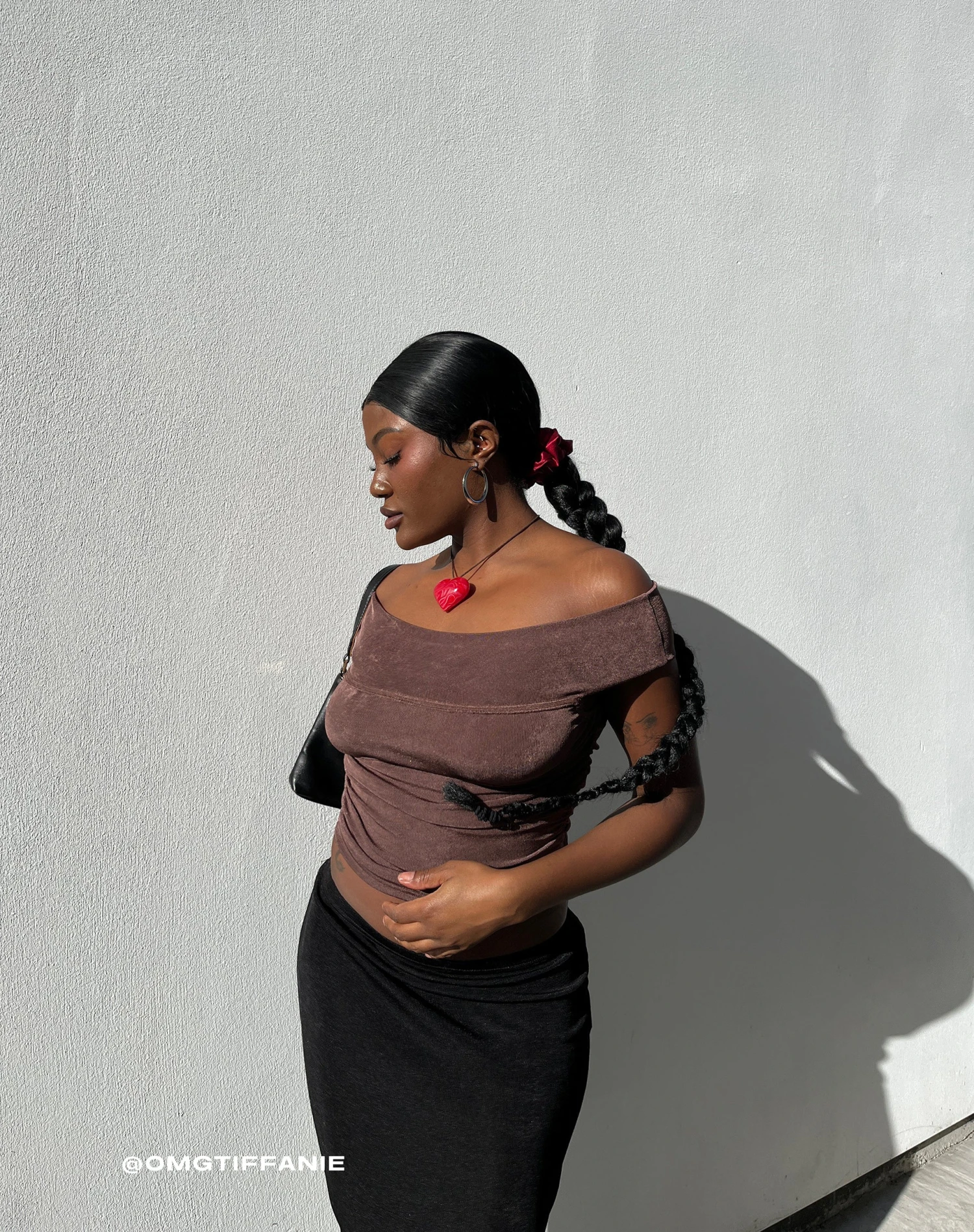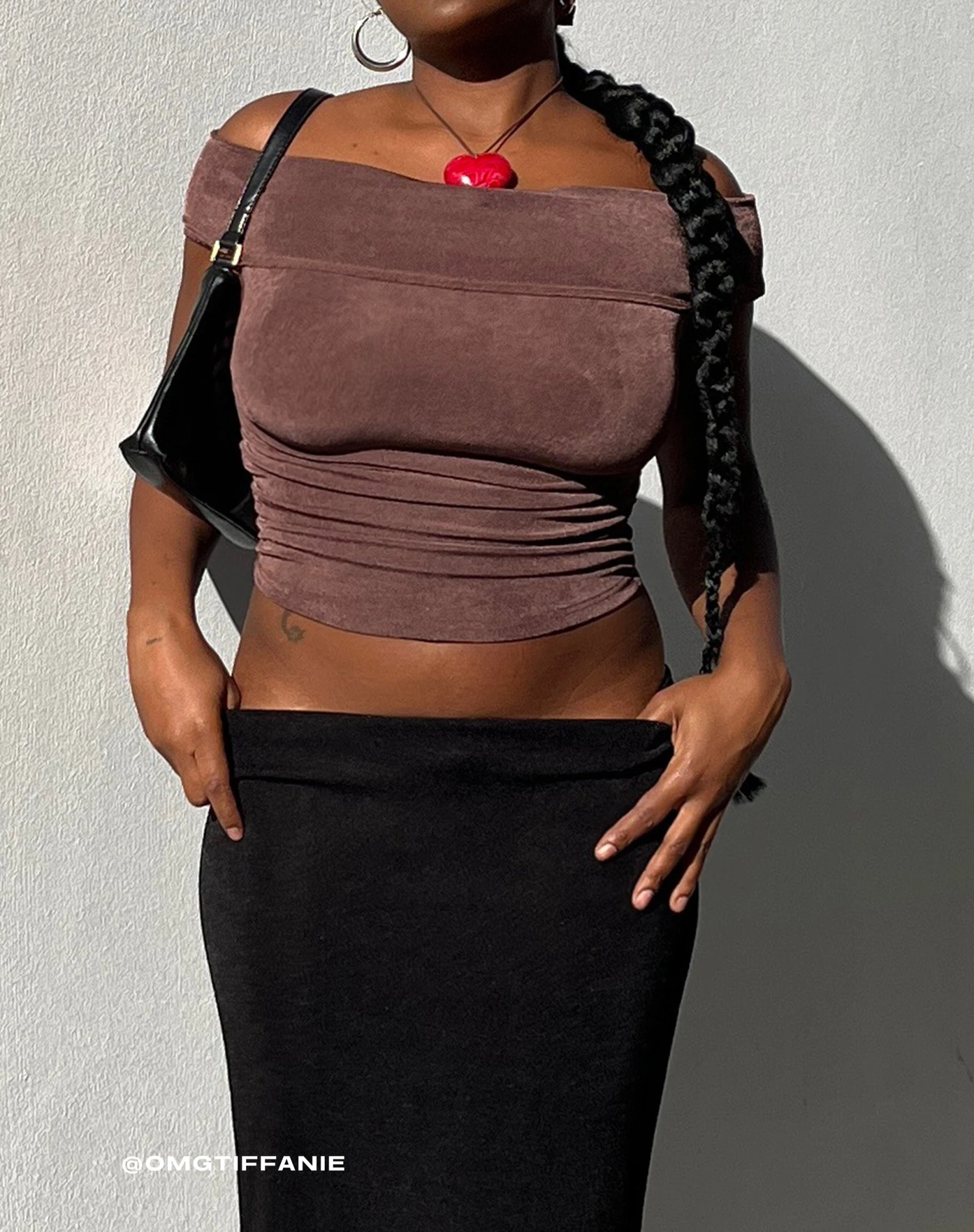 Slinky crepe off the shoulder crop top. Pair with our Tulus maxi skirt for a cute ‘fit.Â