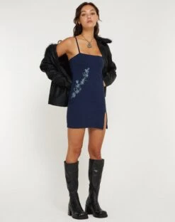 Strappy square neck navy bodycon mini dress with side split detailing featuring an embroidered butterfly floral motif.