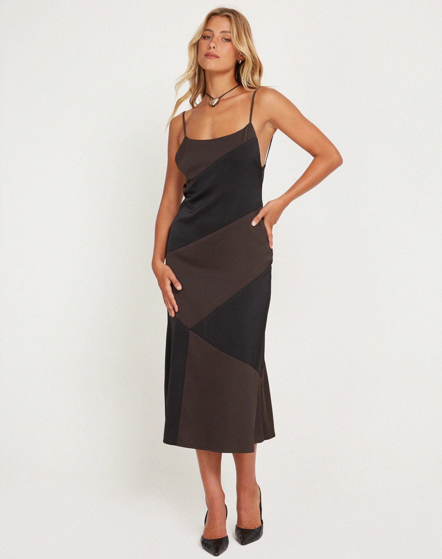 An essential satin midi dress your wardrobe needs. The Perlita Dress features an asymmetrical design, thin straps in a two tone black colour.
