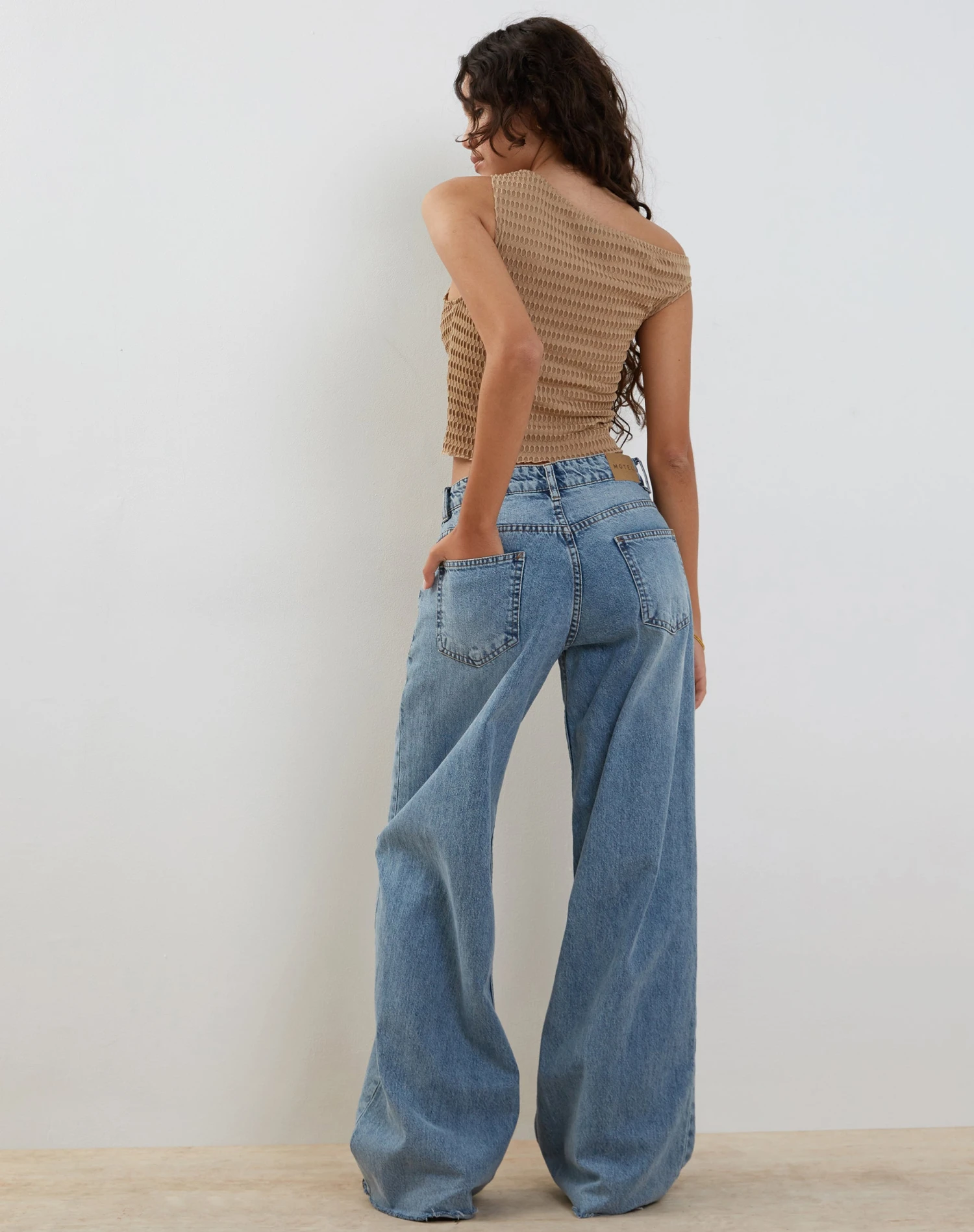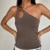 The Peyton top features a sleeveless, one shoulder design with bodycon fit, regular hem and a crew neckline in an oat knit fabric with 3D waffle detailing. Get the look with our Roomy jean.Â