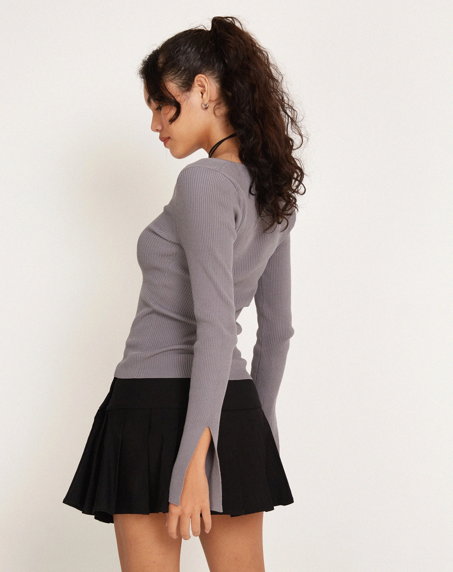 Add this to your basics collection – our Rahne Long Sleeve Top features a front tie and cut out flowy sleeves in a flint grey colour. Pair with our Casini skirt.Â