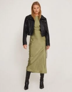 In an olive satin fabric, our Raybu dress is the perfect party piece. It features a midi length, with a loose, sleeveless fit, crew neckline and side ruching with tie strings.
