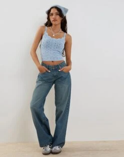 In a lightweight baby blue pointelle knit, our Reagan cami features a square neckline and scallop trim straps. Get the look with our Roomy jean.Â