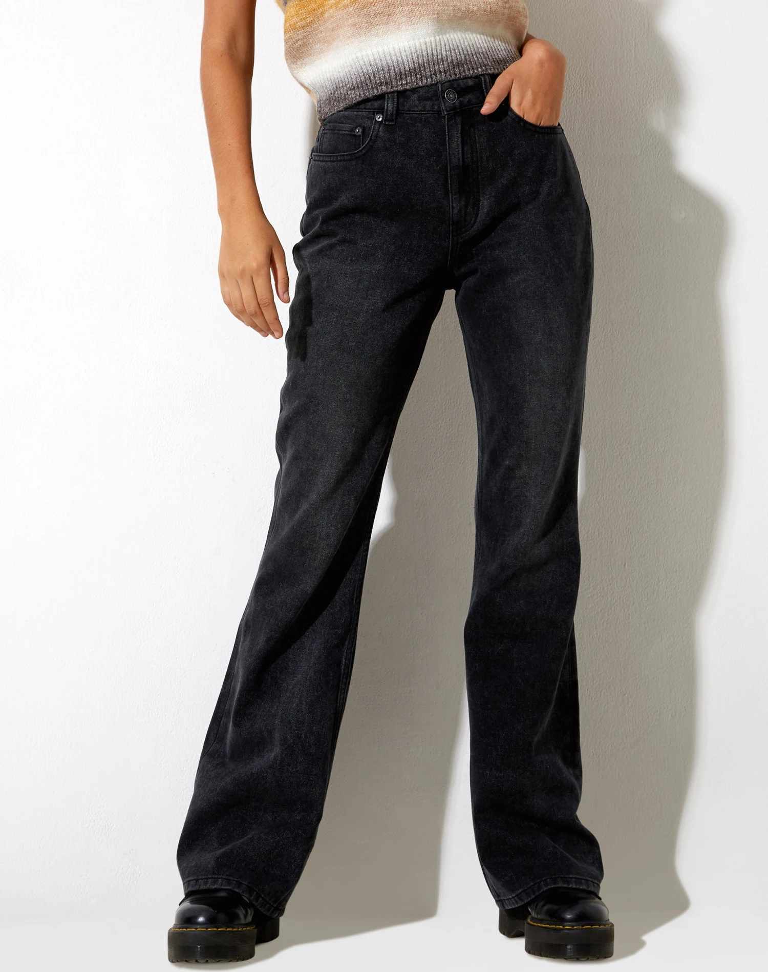 Add some flares to your wardrobe with our relaxed bootleg jeans. In a black grunge, they feature a flared leg, high waisted fit with belt loops, pockets and a concealed zip and button fastening. Style with a knitted vest and add our Cavita jacket.