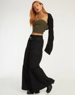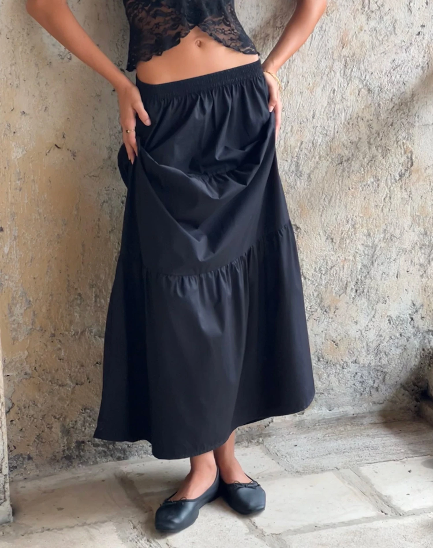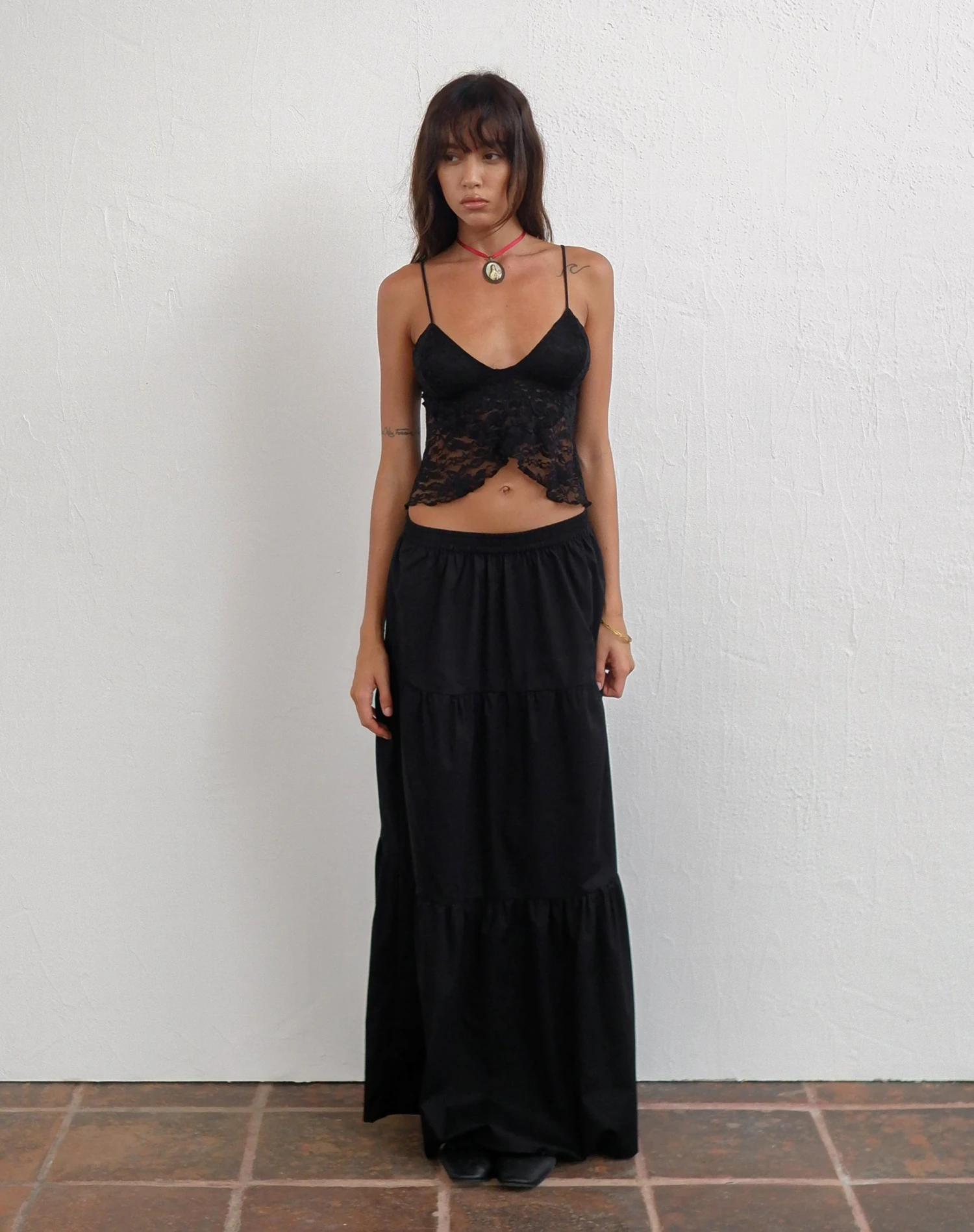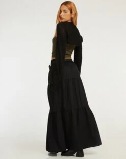 The must-have skirt for this season. Remax, in black, features a tiered hem design and maxi length. We love to style with the Nobila shrug.
