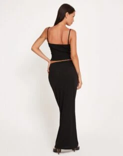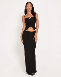 In a black tailoring fabric, the Revonda top features a slim-ft, corset design with adjustable, cami straps, a square neckline and a curved cut-out to hem with suspender straps. Completed with ruched detailing and a decorative pink bow to neckline. We like to style with the Tsuna skirt.Â