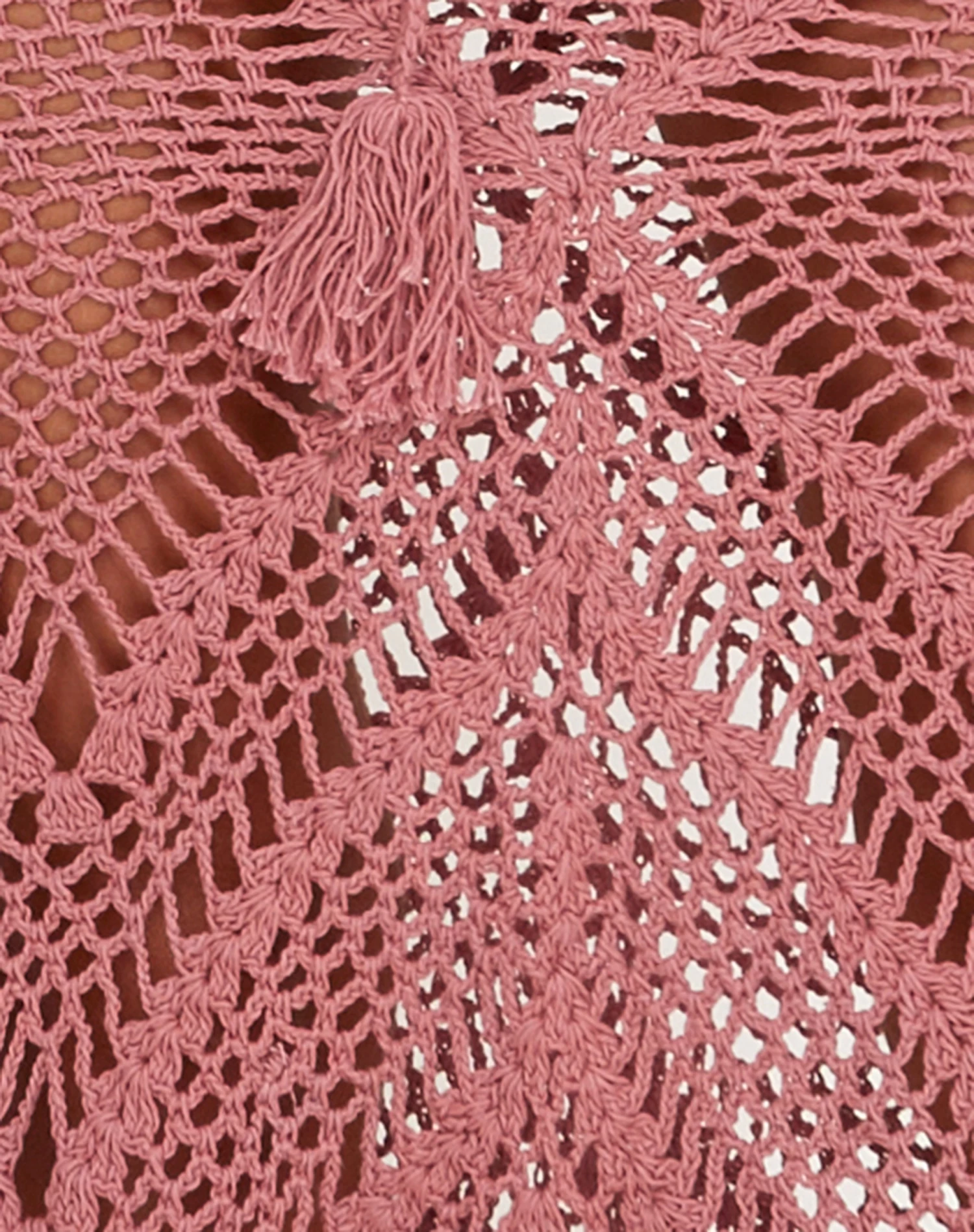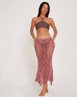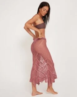 We are obsessed with our Riyati skirt. In mauve, it features a low rise fit in a crochet pattern with midi length and waterfall hem. The perfect swimwear cover up. We love to wear with our Zymo bikini top.