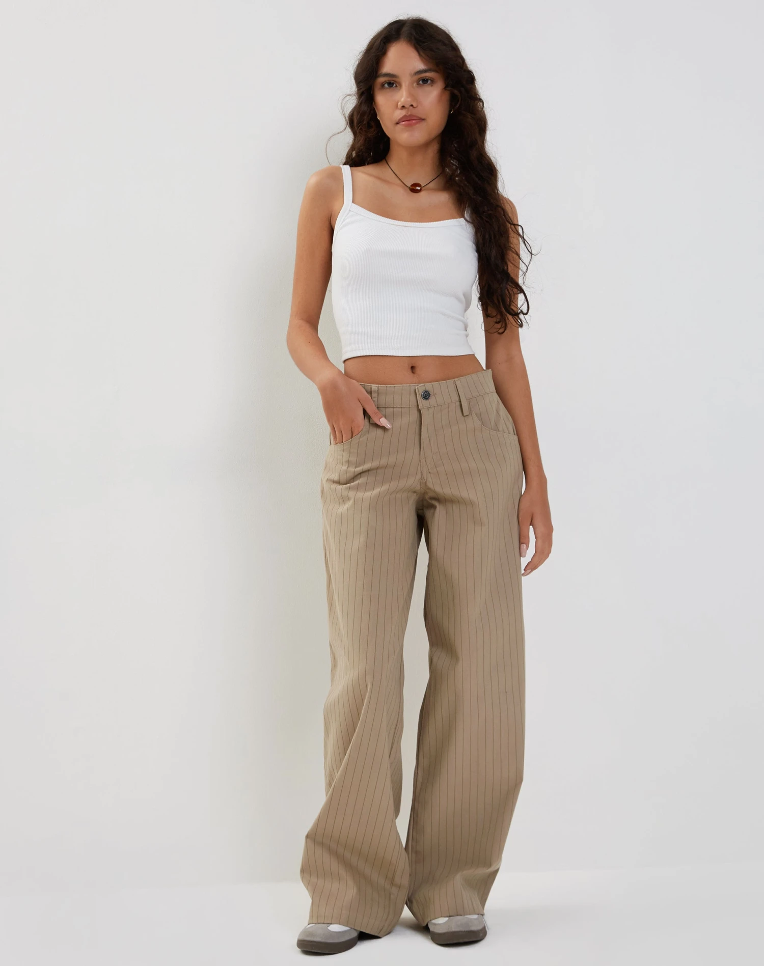 In a stone pinstripe Panama fabric, our Roomy trousers feature extra wide legs and a low waistline with zip and button fastening, functional belt loops and pockets. We love to style with our Aus vest.