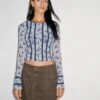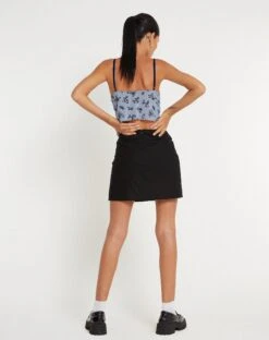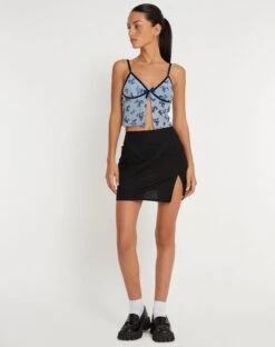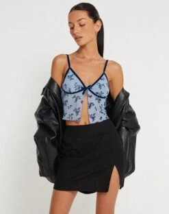 The Rumako top is an essential. In light blue black botanist flocking, this crop features an open front, a v neckline and thin straps with a bow detailing. Complete the co-ord with our Rinzi skirt.Â