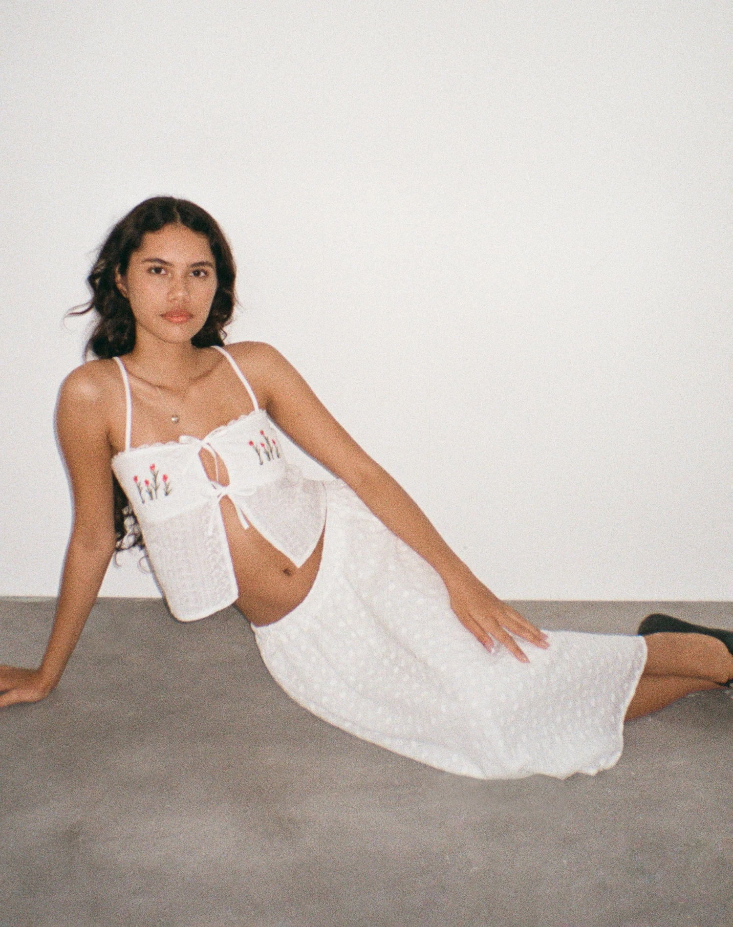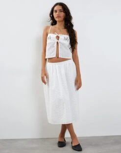 Our Rusma skirt features a Low rise waist and midi length hem in a lightweight white broderie fabric. Style with the matching Ramika top.Â