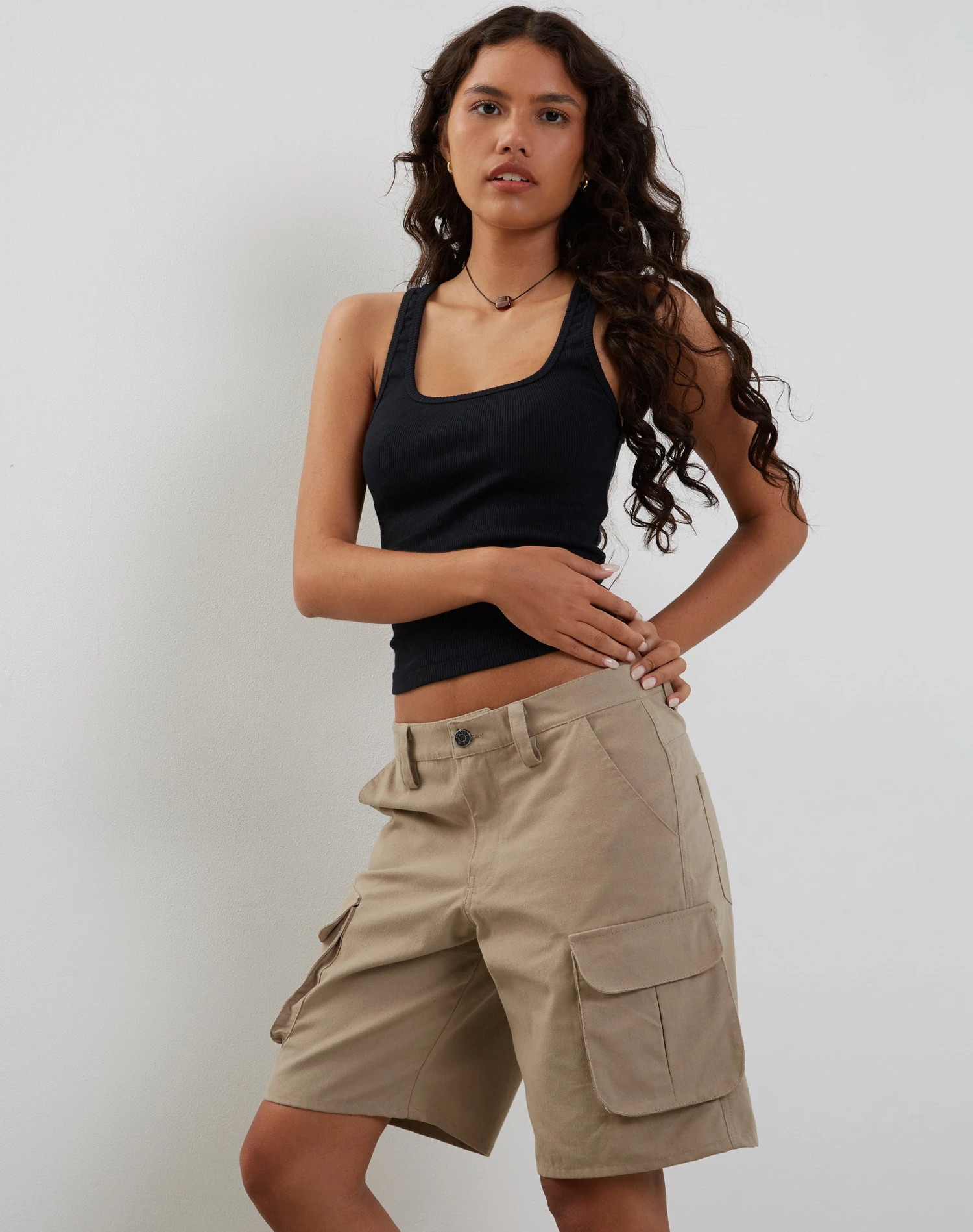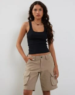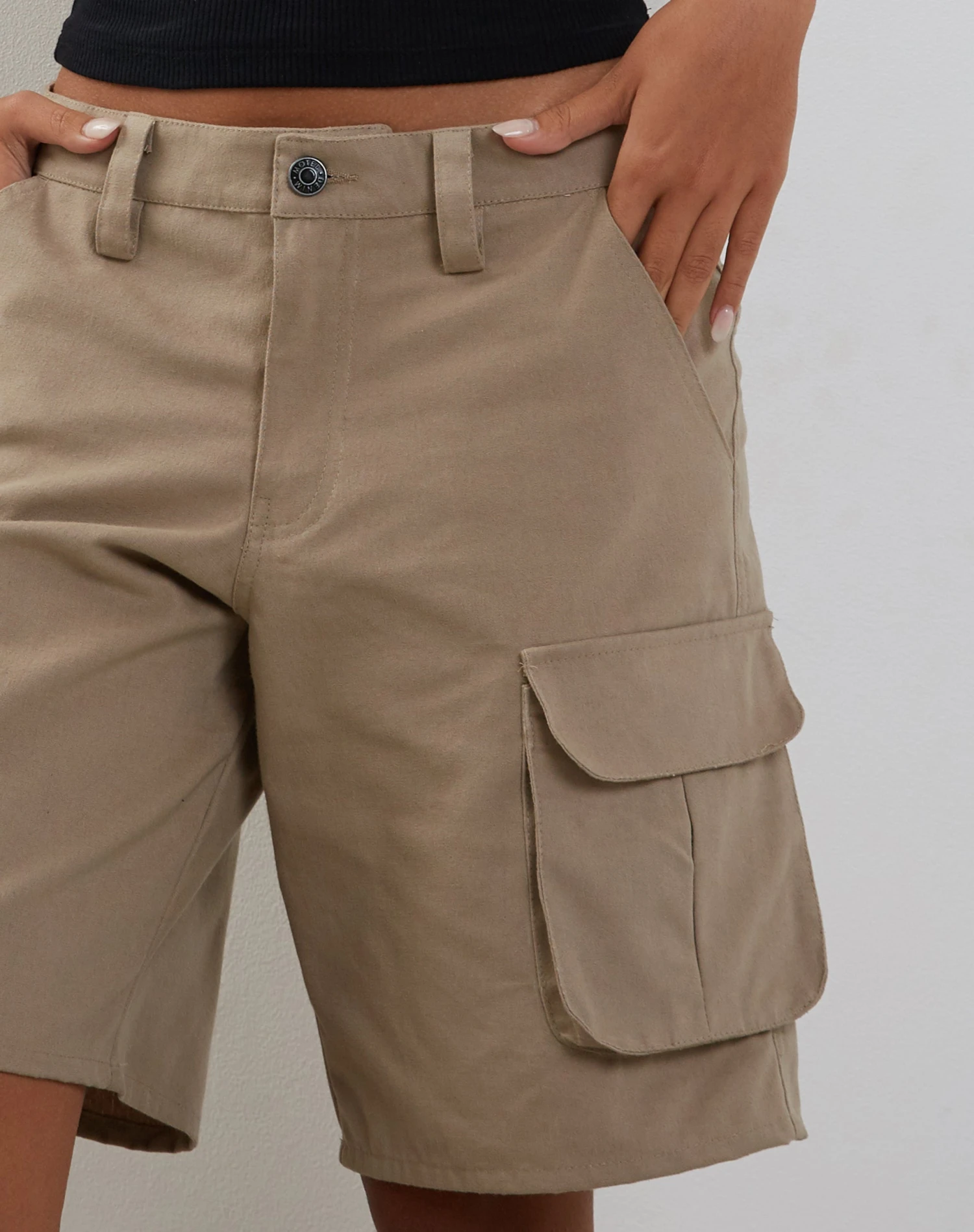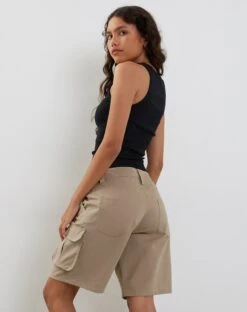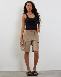 Our Saito shorts, in stone, feature cargo pockets and a low rise waist in a longline fit.