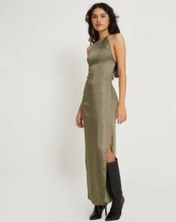 Halterneck sleeveless dress in a dark olive satin fabric, featuring an open tie detail back in a maxi length.
