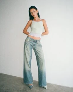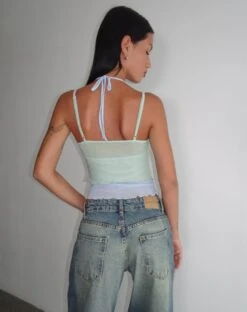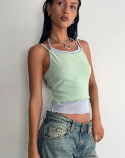 The basic with a twist. The Sapphi Cami Top features thin straps, a bodycon fit and two layers in frost blue and sage green. Best paired with our Roomy jean.Â