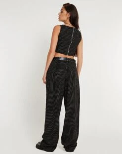 Elevate your wardrobe with our Saskira trouser. Featuring a wide leg with pockets and belt loops in a pinstripe black. Match it up with the Targun top.