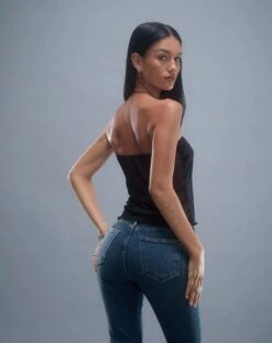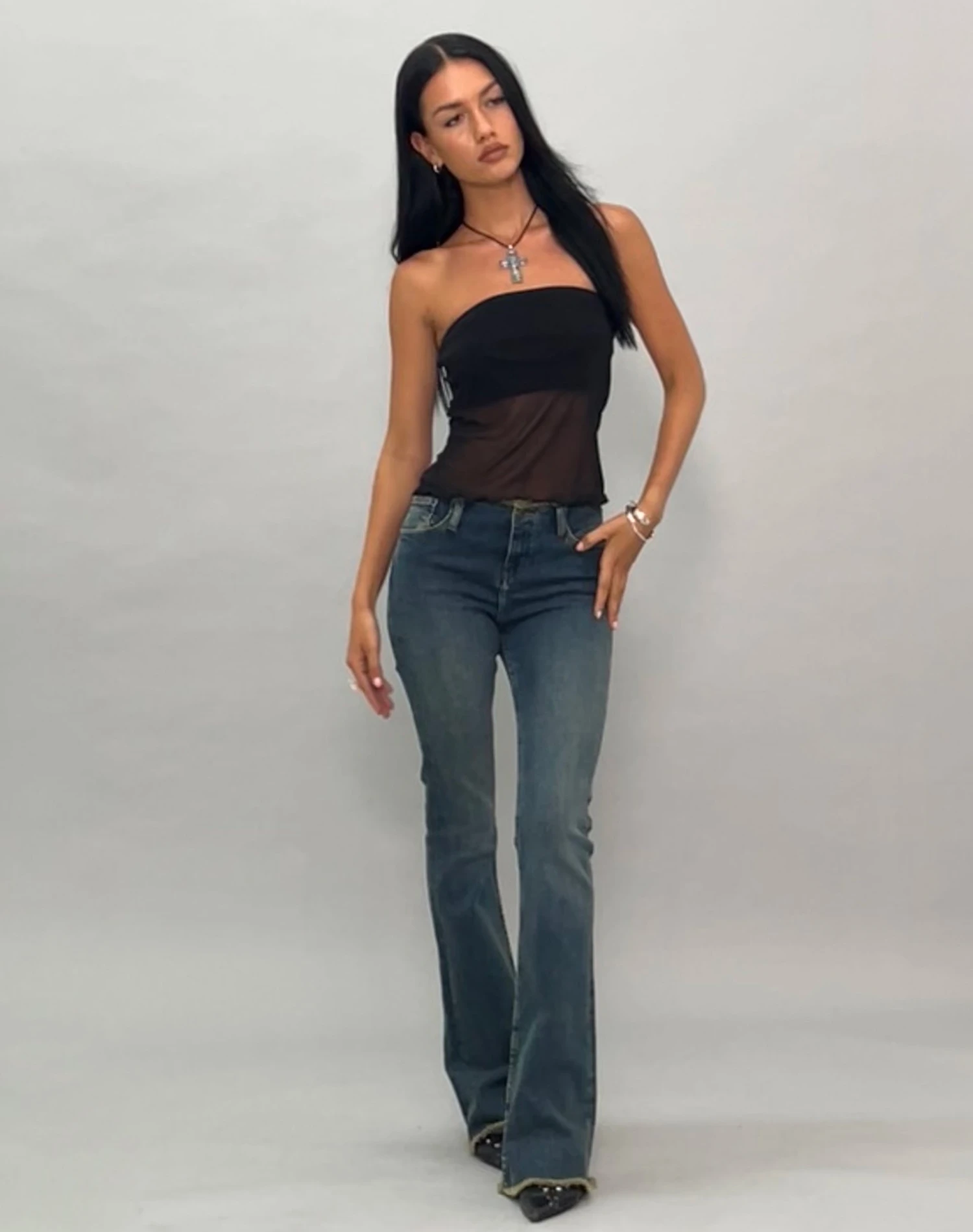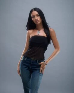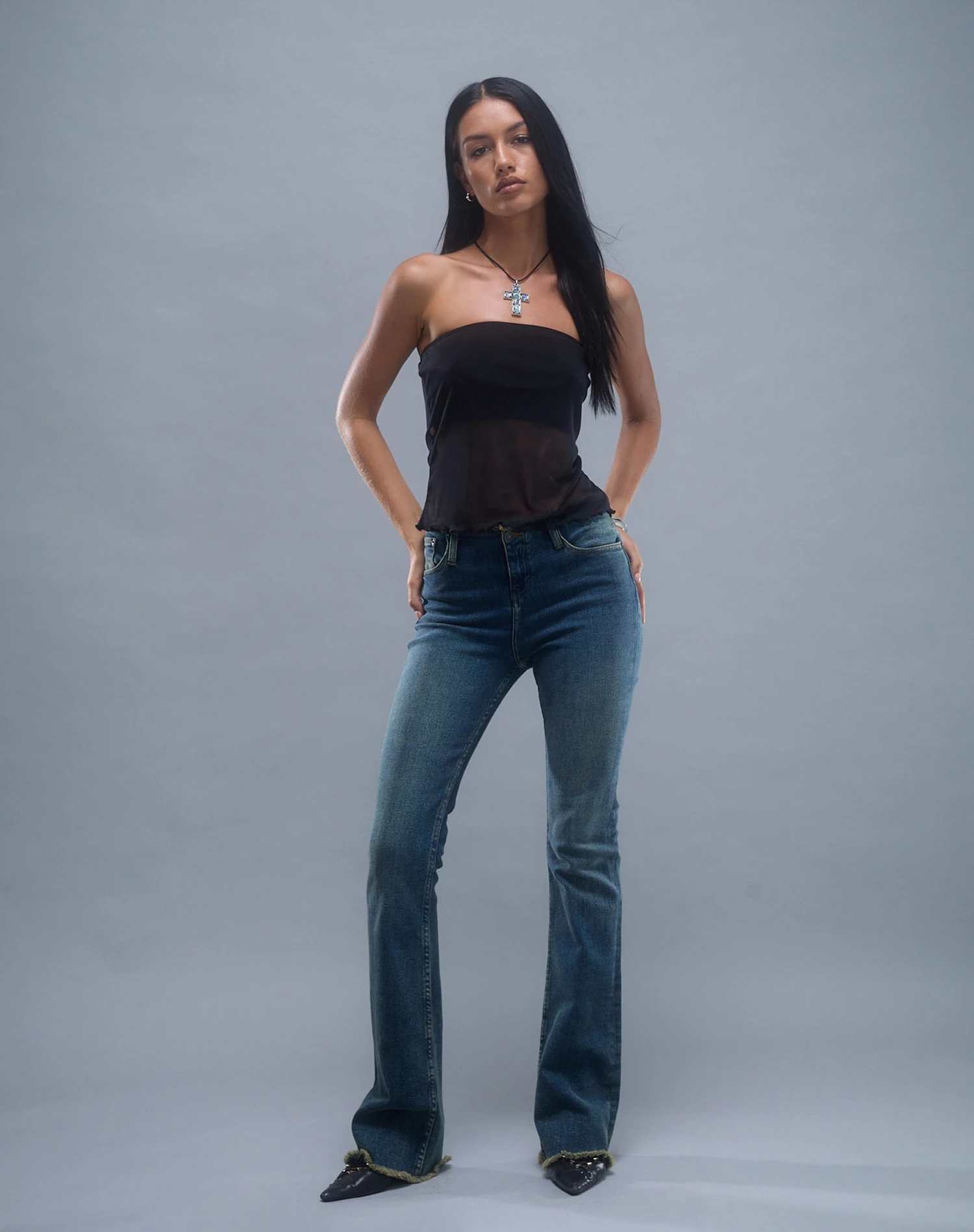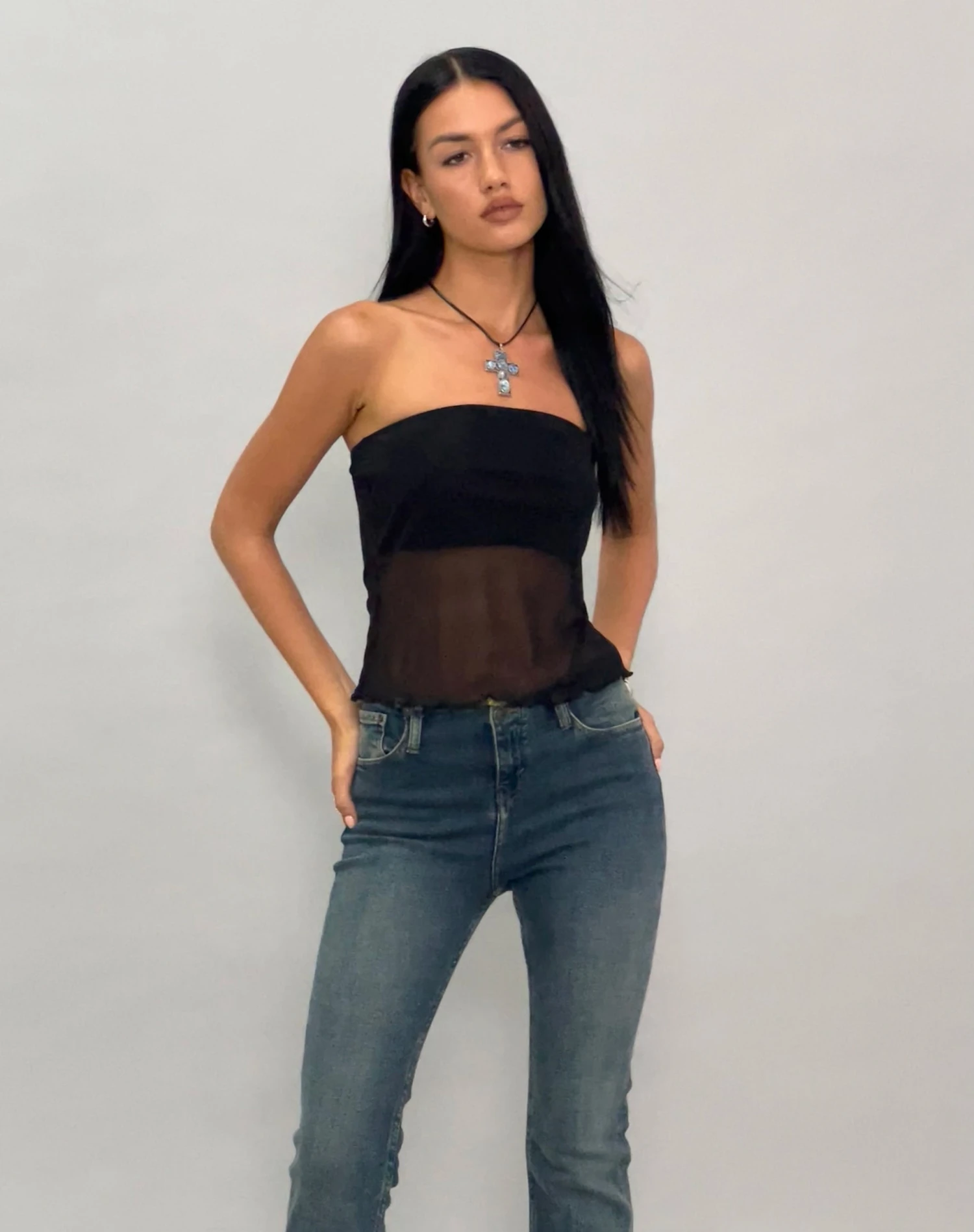 Saturi in black mesh features a bandeau neckline with block bust detailing and a longline body with a lettuce trim hem. Paired with our Frayed Low Rise Jeans.Â