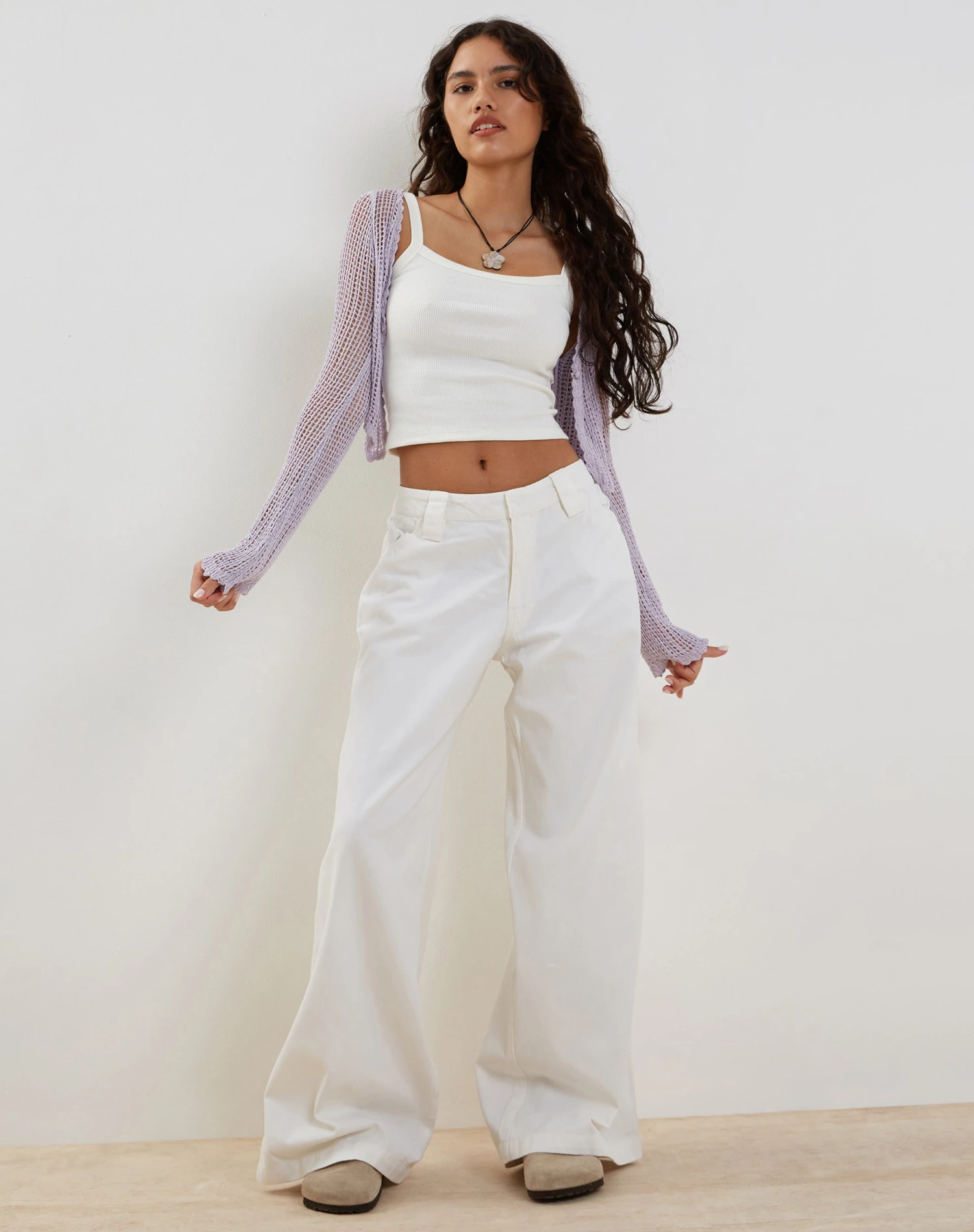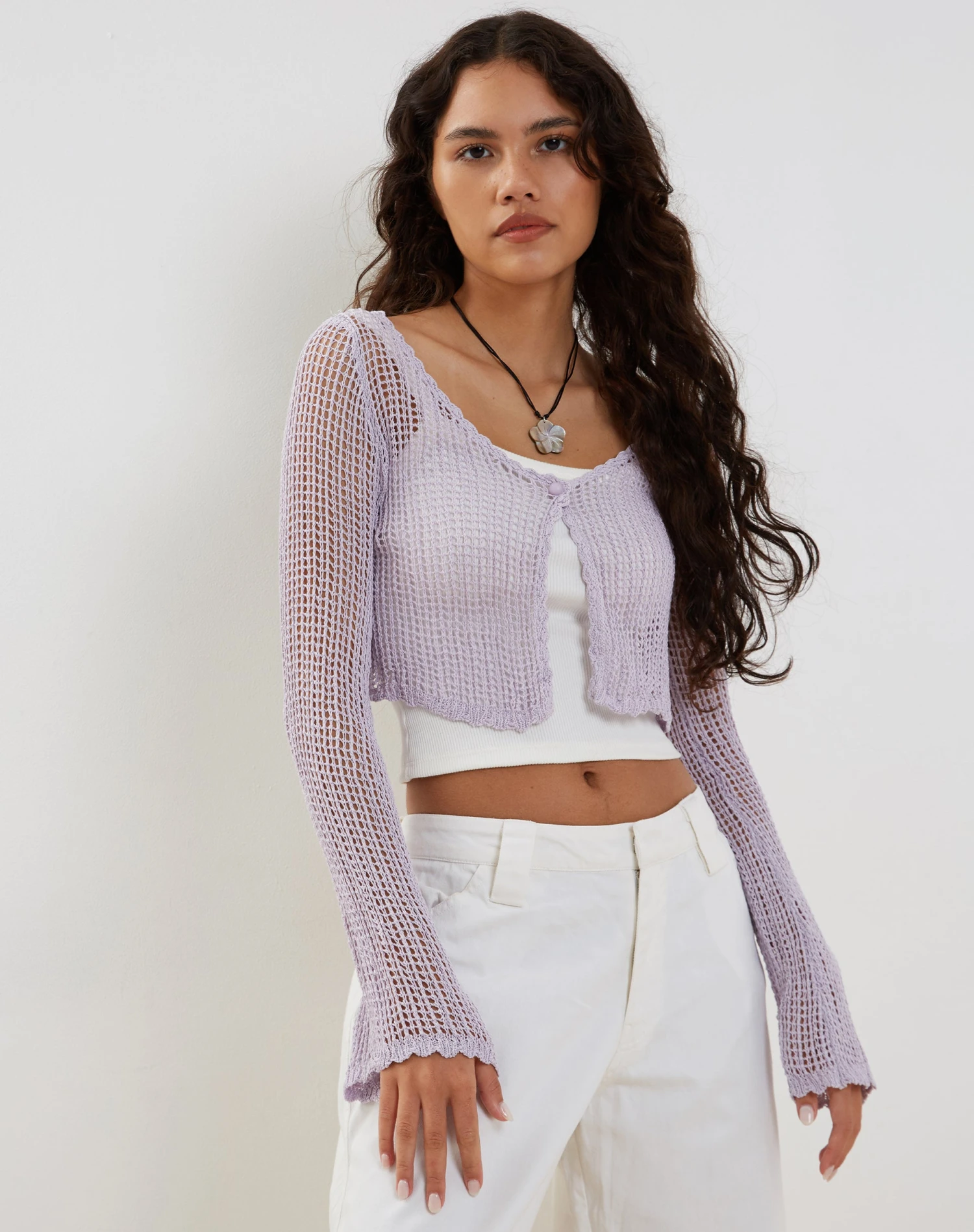 In an open weave knit, our Septa cardigan features long sleeves and single button fastening with cropped fit in lilac. We love to style over our Aus vest.Â