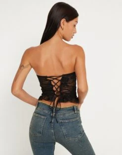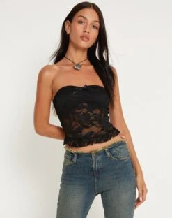 Cropped bandeau top with sleeveless design, in a black, lace material. Featuring a bow at the front, and a peplum hem. We love to style with our Magata skirt.