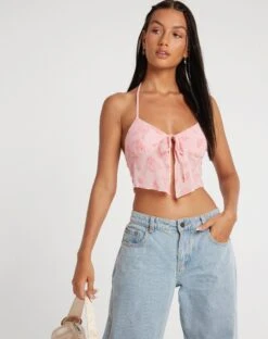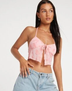 The Shara top will complete your summer styling. Featuring a cropped fit with thin straps and tie up detailing in a pink butterfly print. For the perfect look pair with the Parallel jeans.